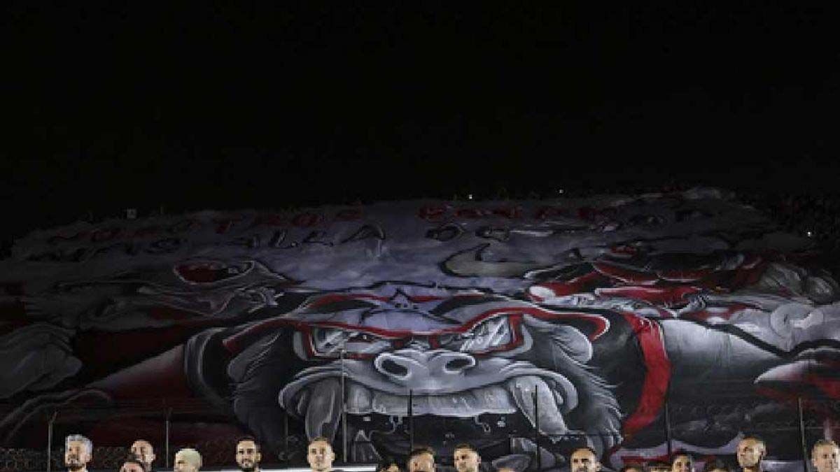 “Nosotros estamos más allá de todo”, decía la frase que encabezaba el trapo y que estaba acompañada por tres dibujos: un mono con lentes, un toro y un gallo, todos con los colores rojinegro.