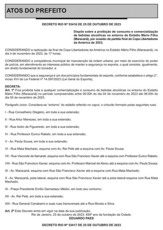 El intendente de Río de Janeiro, Eduardo Paes, publicó este jueves (26/10) una resolución en la que decretó la “Ley Seca” de cara a la final entre Fluminense y Boca Juniors de la Copa Libertadores.