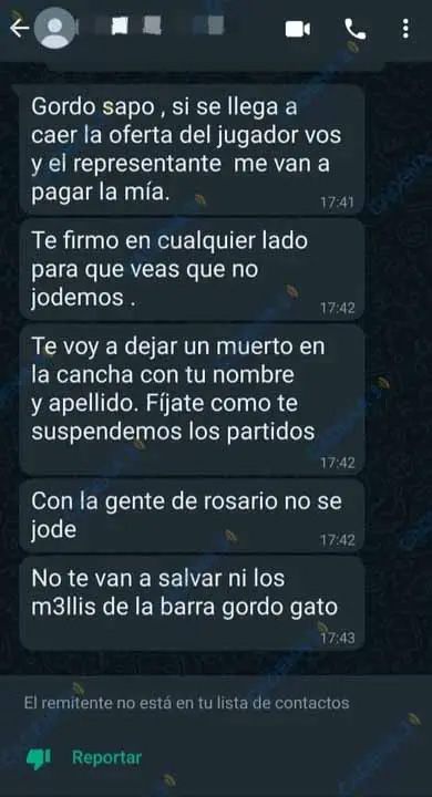 Instantes más tarde, continuaron: “Te voy a dejar un muerto en la cancha con tu nombre y apellido. Fijate como te suspendemos los partidos. Con la gente de Rosario no se jode”.