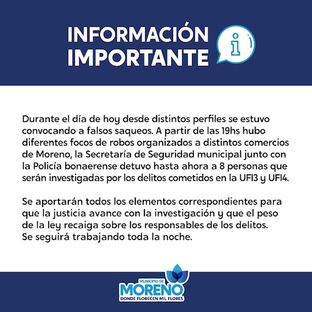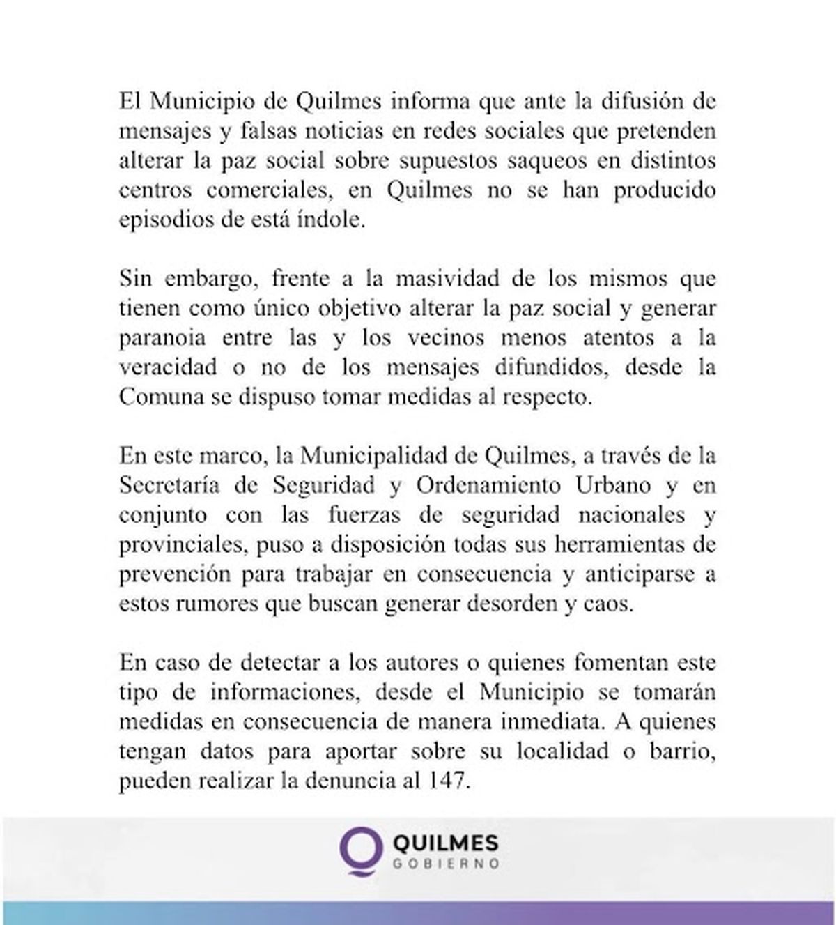 El Municipio de Quilmes informa que ante la difusión de mensajes y falsas noticias en redes sociales que pretenden alterar la paz social sobre supuestos saqueos en distintos centros comerciales, en Quilmes no se han producido episodios de está índole.