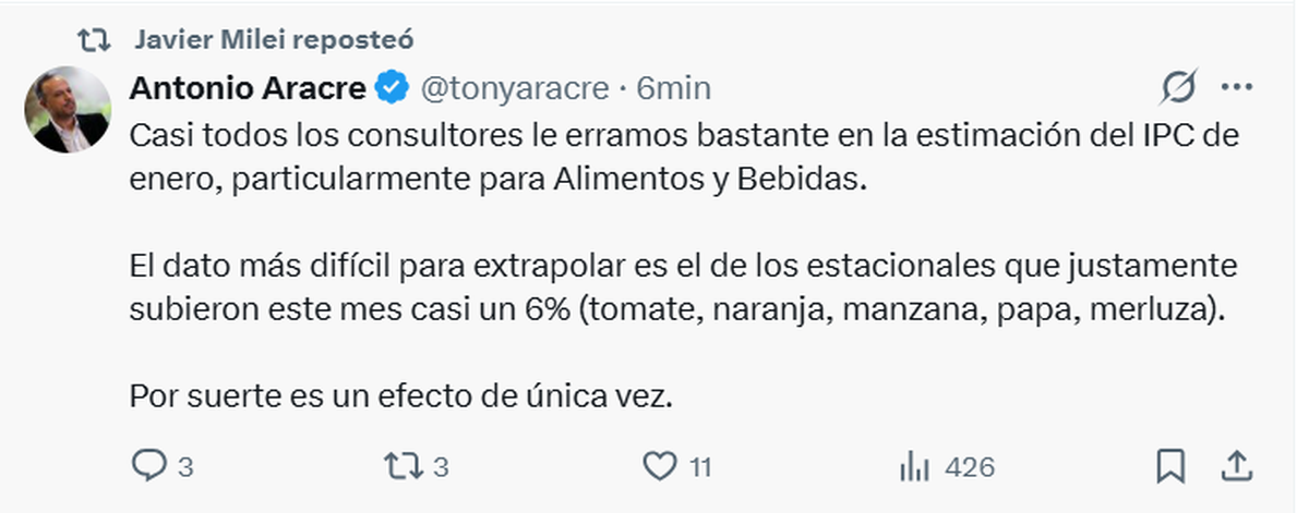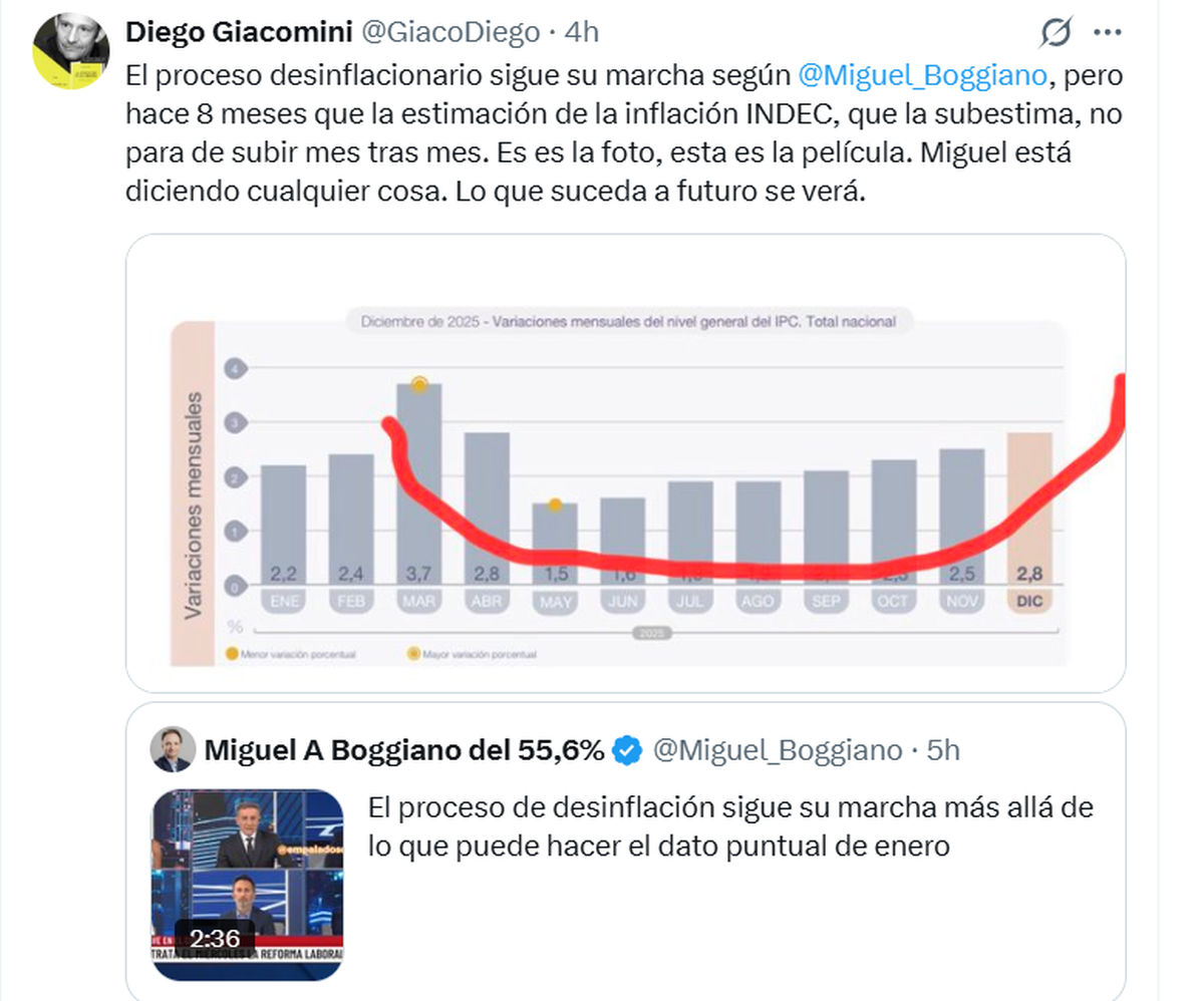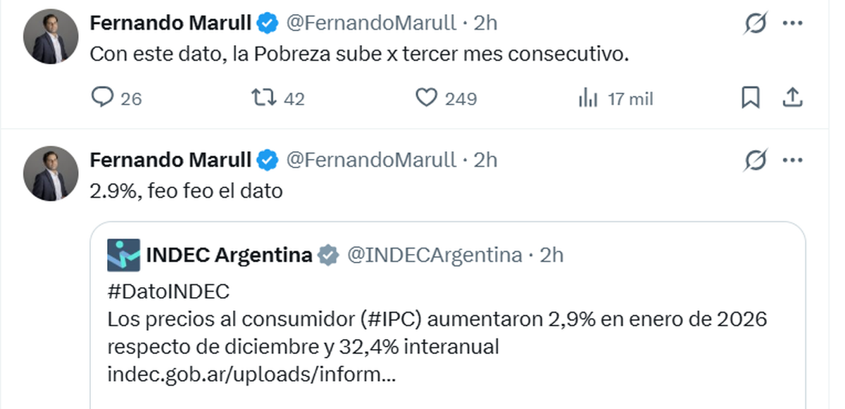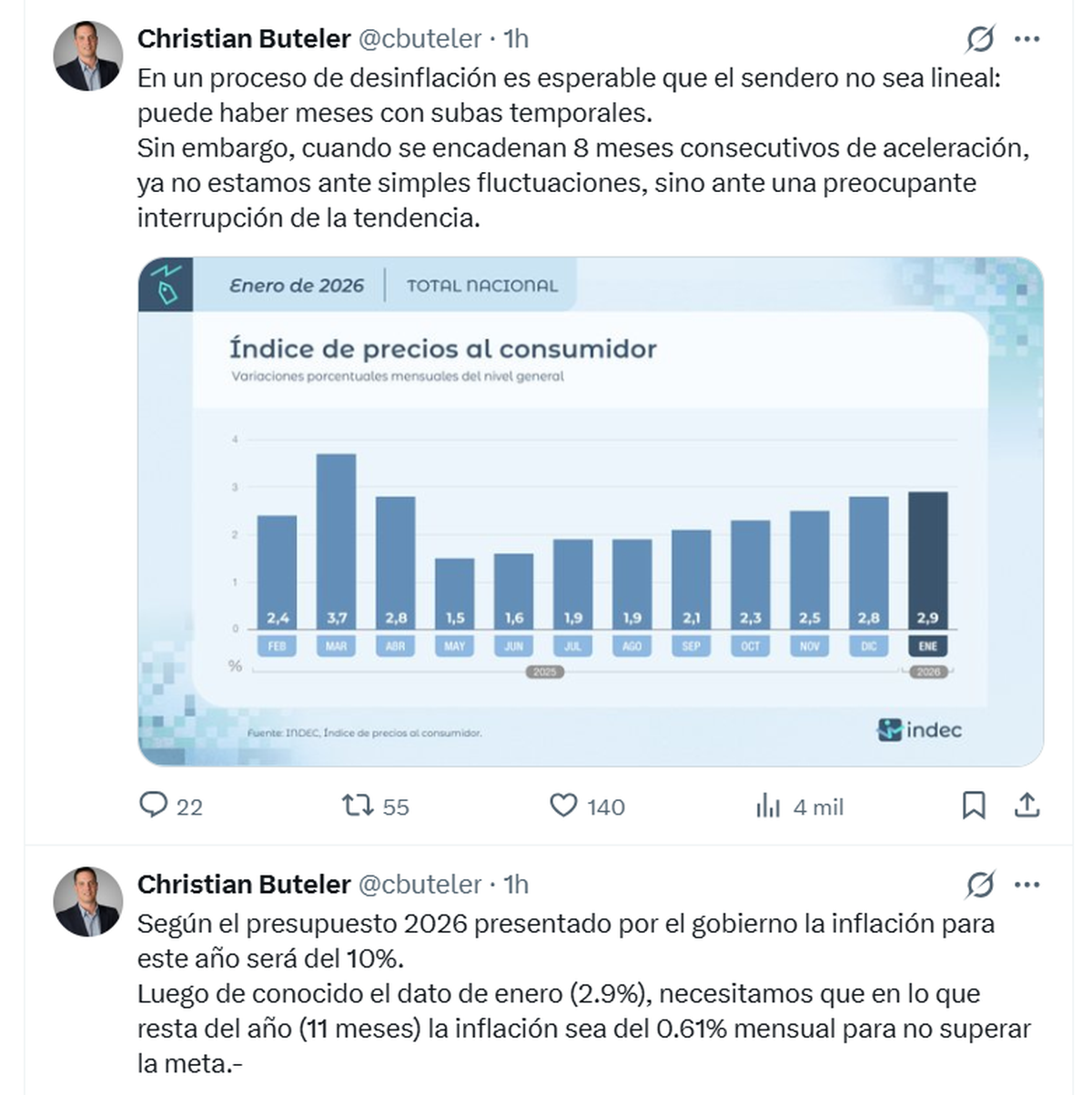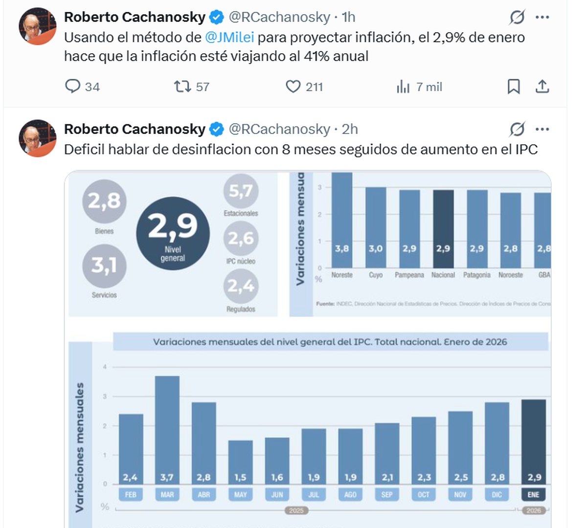 El dato del INdEC de enero 2026 revela que el relato libertario de la "desinflación" quedó destruido (Urgente24 viene advirtiendo hace tiempo que Javier Milei perdió a su 'caballito de batalla'): 2,9% de suba respecto a diciembre 2025, y 8vo. mes consecutivo de aumento mensual del IPC. Y eso, sin haber actualizado la metodología de medición, como se había prometido, lo que probablemente daría un número más alto. A la par, la credibilidad del Gobierno, y del ente estadístico, ya quedó erosionada con esa postergación de último momento.
