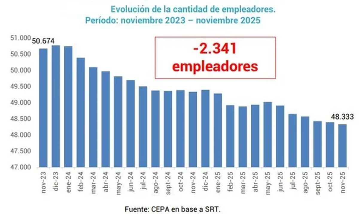 Desde la asunción del presidente Javier Milei, el entramado empresarial argentino sufrió una marcada retracción que resultó en la desaparición de 21.938 empresas. Según cifras oficiales de la Superintendencia de Riesgos del Trabajo (SRT), el número de empleadores con trabajadores registrados cayó de 512.357 en noviembre de 2023 a 490.419 en el mismo mes de 2025.