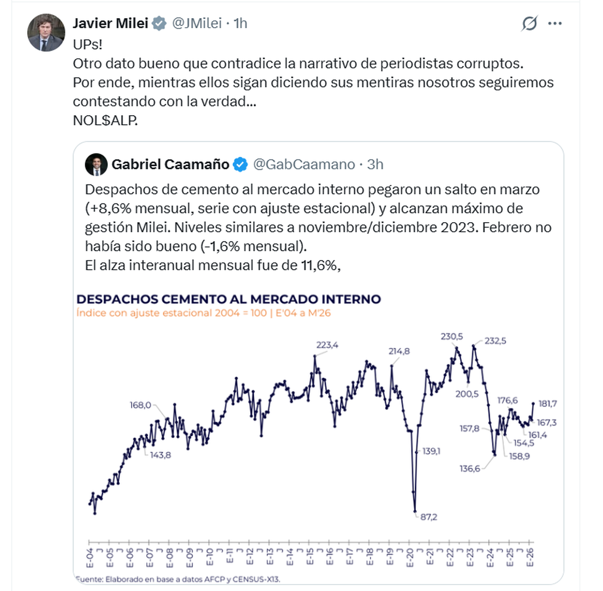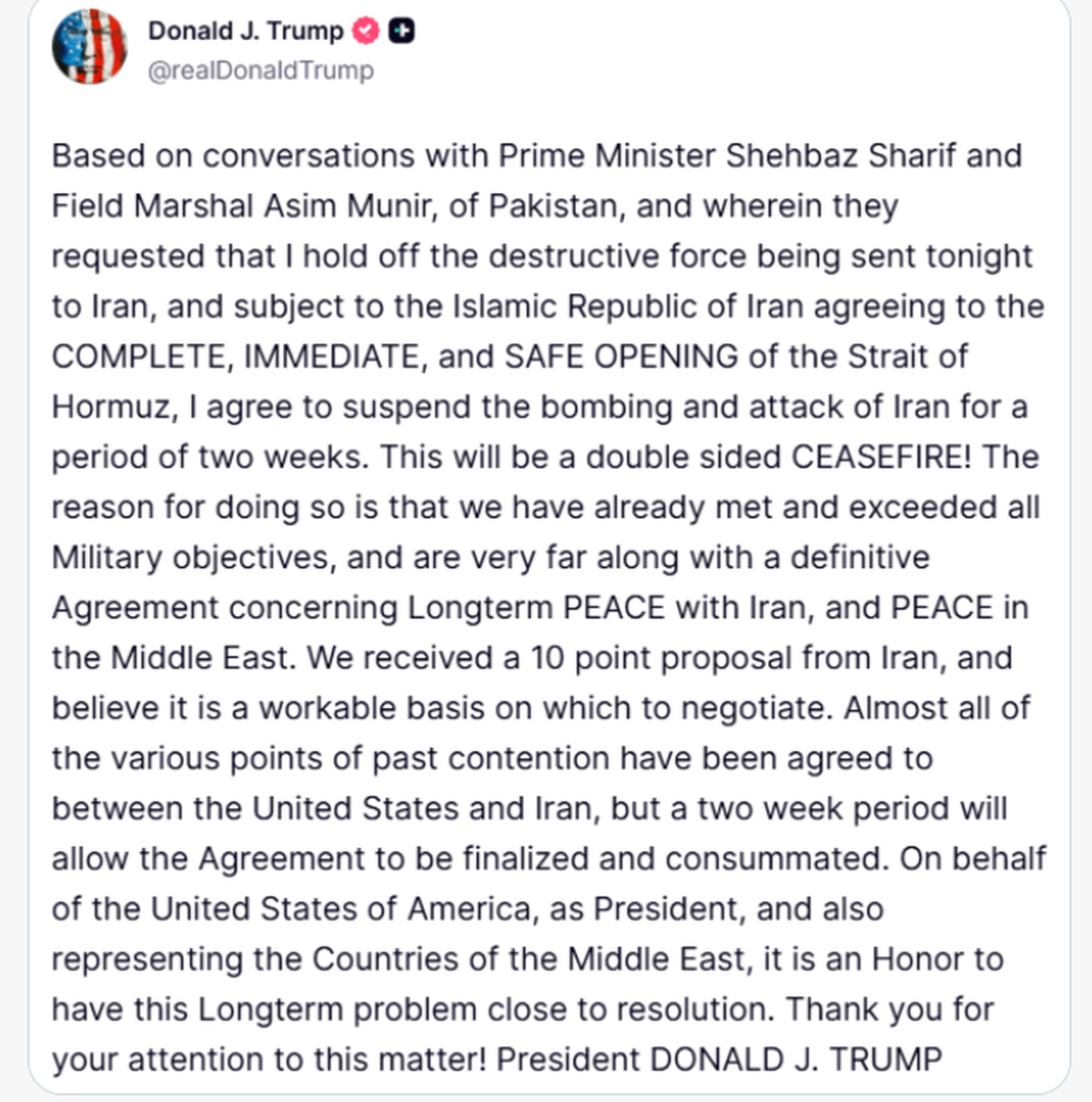 "Basado en conversaciones con el Primer Ministro Shehbaz Sharif y el Mariscal de Campo Asim Munir, de Pakistán, y en las que me solicitaron que detuviera la fuerza destructiva que se envía esta noche a Irán, y sujeto a que la República Islámica de Irán acepte la APERTURA COMPLETA, INMEDIATA y SEGURA del Estrecho de Ormuz, acepto suspender el bombardeo y el ataque a Irán por un período de dos semanas. ¡Esto será un ALTO EL FUEGO de doble cara! La razón para hacerlo es que ya hemos cumplido y superado todos los objetivos militares, y estamos muy lejos de lograr un Acuerdo definitivo sobre PAZ a largo plazo con Irán y PAZ en Medio Oriente. Recibimos una propuesta de 10 puntos de Irán y creemos que es una base viable para negociar. Casi todos los diversos puntos de disputas pasadas han sido acordados entre Estados Unidos e Irán, pero un período de dos semanas permitirá finalizar y consumar el Acuerdo. En nombre de los Estados Unidos de América, como Presidente y también en representación de los países del Medio Oriente, es un honor que este problema de largo plazo esté cerca de resolverse. ¡Gracias por su atención a este asunto!"