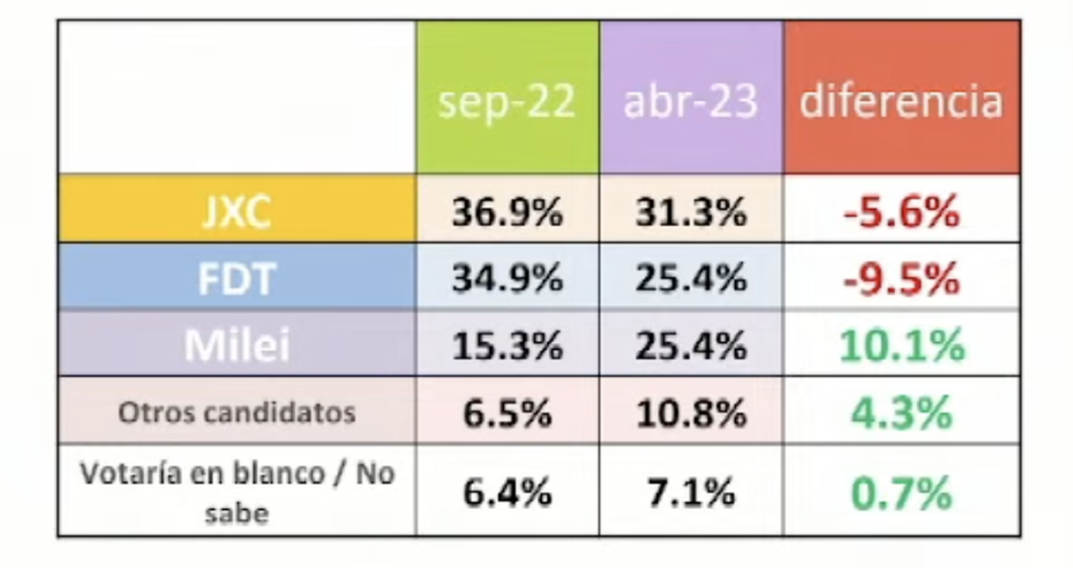 En tanto, Aresco abona esta teoría: Milei es el más beneficiado de la caída del Frente de Todos entre septiembre 2022 y abril 2023.