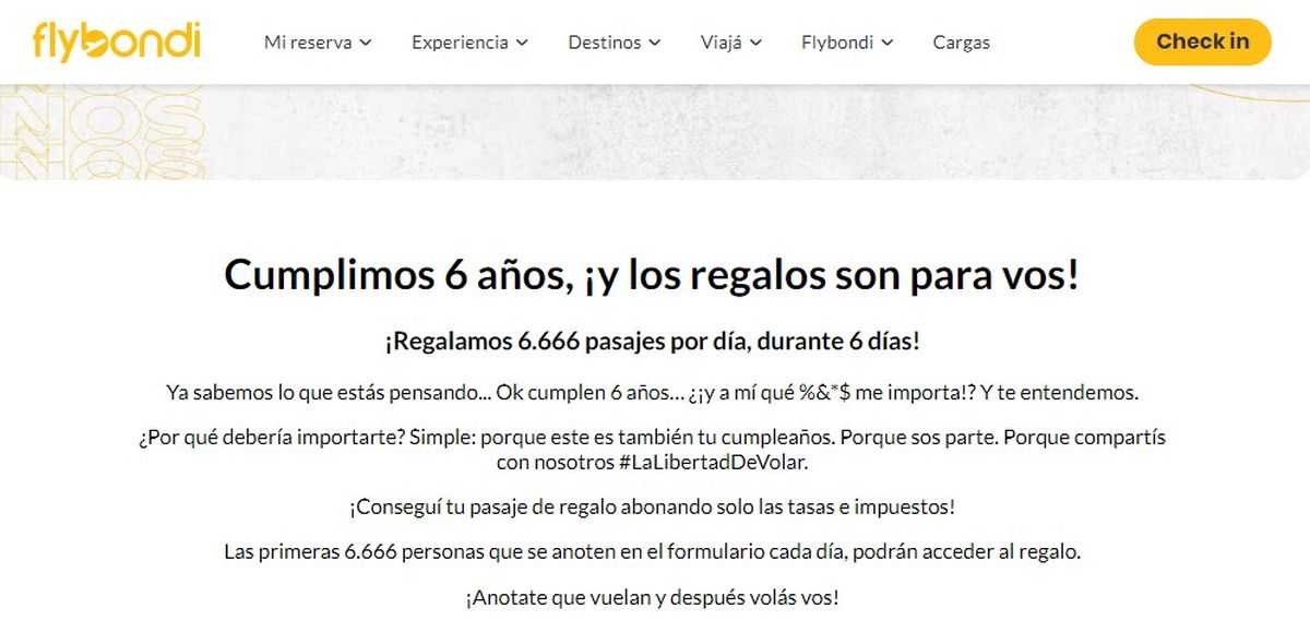 Flybondi lanzó toda una campaña en torno a su cumpleaños número 6 y como agradecimiento a sus clientes, mencionan la posibilidad de participar por un pasaje “regalado” por el cual, solo se debe abonar las tasas e impuestos.