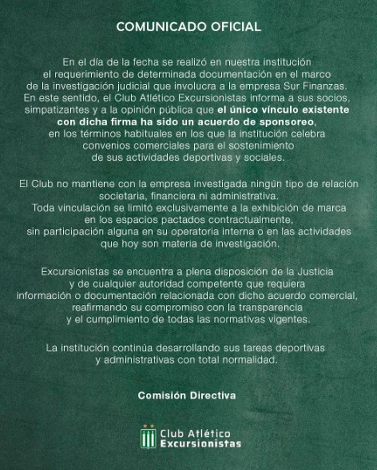 Uno de los primeros clubes en expresarse al respecto fue Excursionistas, que aclaró que "en el día de la fecha se realizó en nuestra institución el requerimiento de determinada documentación en el marco de la investigación judicial que involucra a la empresa Sur Finanzas".