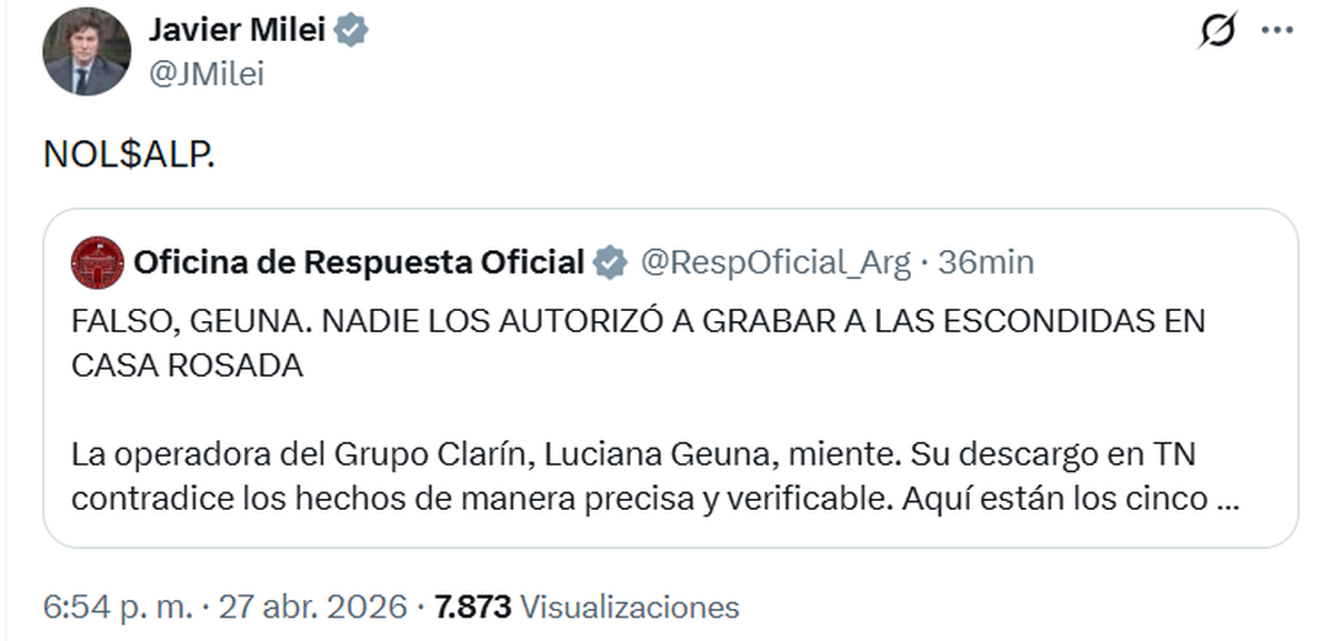 Javier Milei compartió un posteo de la Oficina de Respuesta Oficial contra la "operadora del Grupo Clarín, Luciana Geuna", a quien acusan de mentir, a raíz de su descargo de anoche.