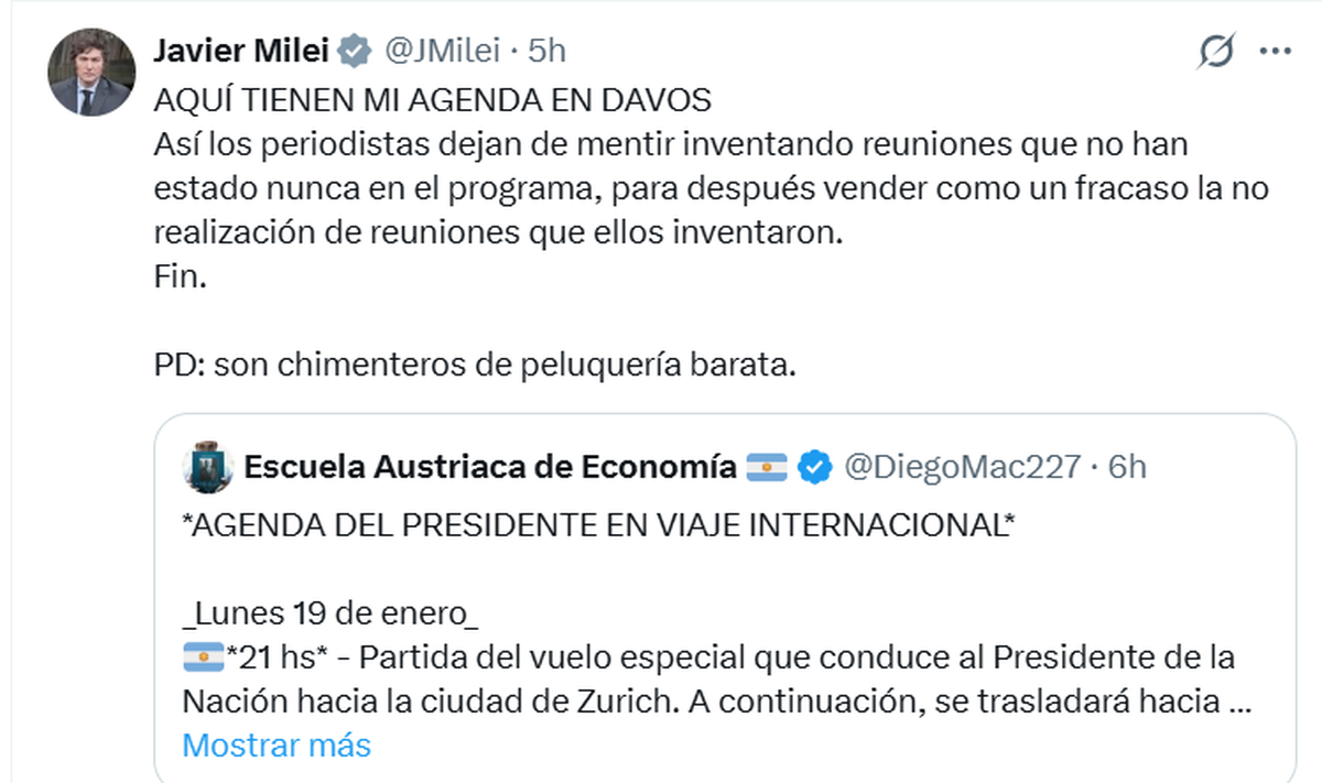 El "odio" de Javier Milei hacia los periodistas no es algo nuevo, aunque viene recrudeciendo conforme avanza su Gobierno y las voces críticas aumentan. Pero lo de este lunes (19/01) ya resulta insólito: el Presidente se enojó con el periodismo por adelantado, dando por sentado que mentirán sobre su " agenda" en Suiza.