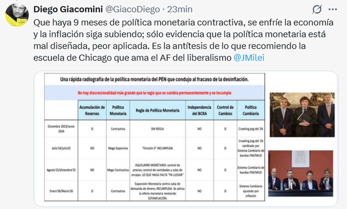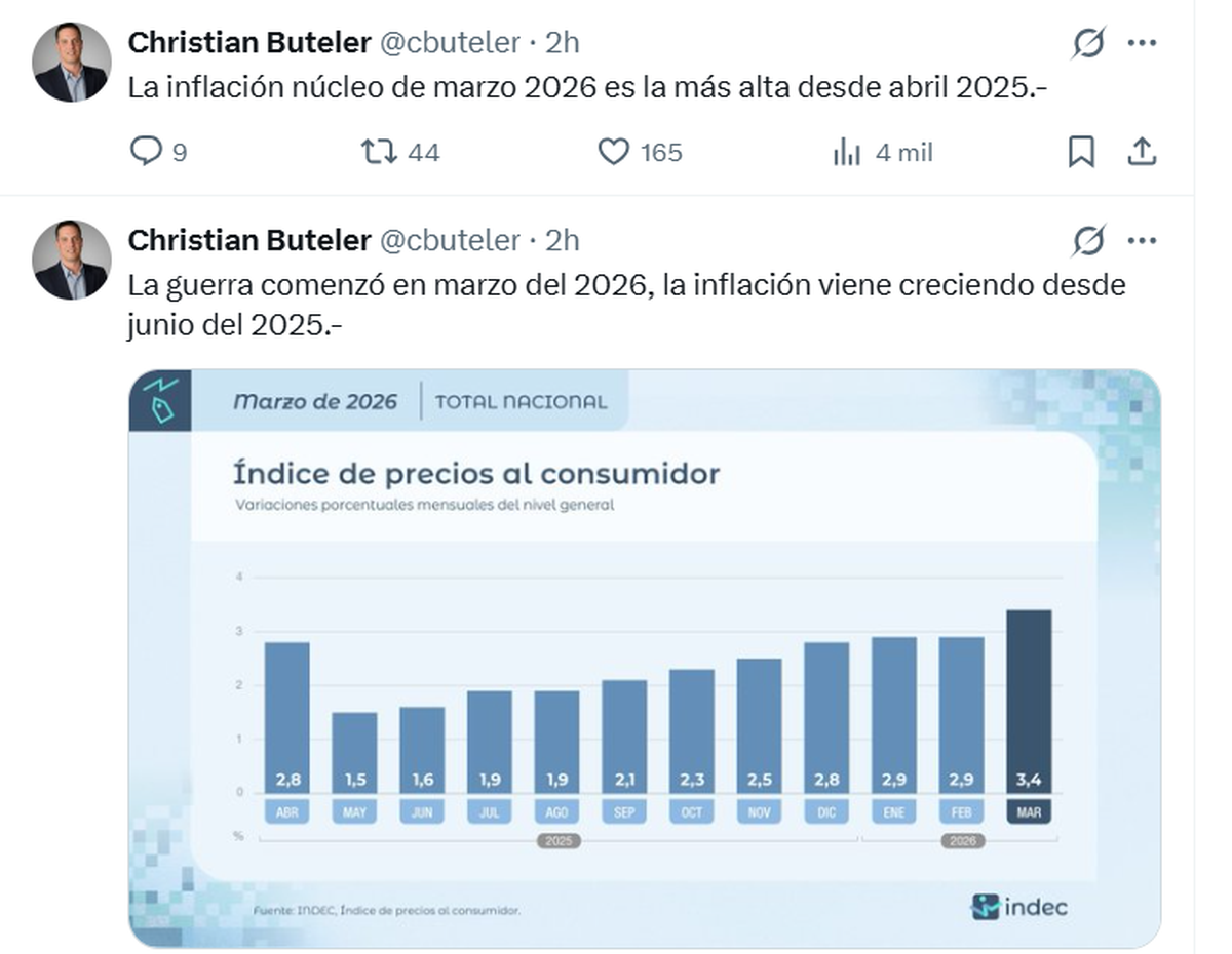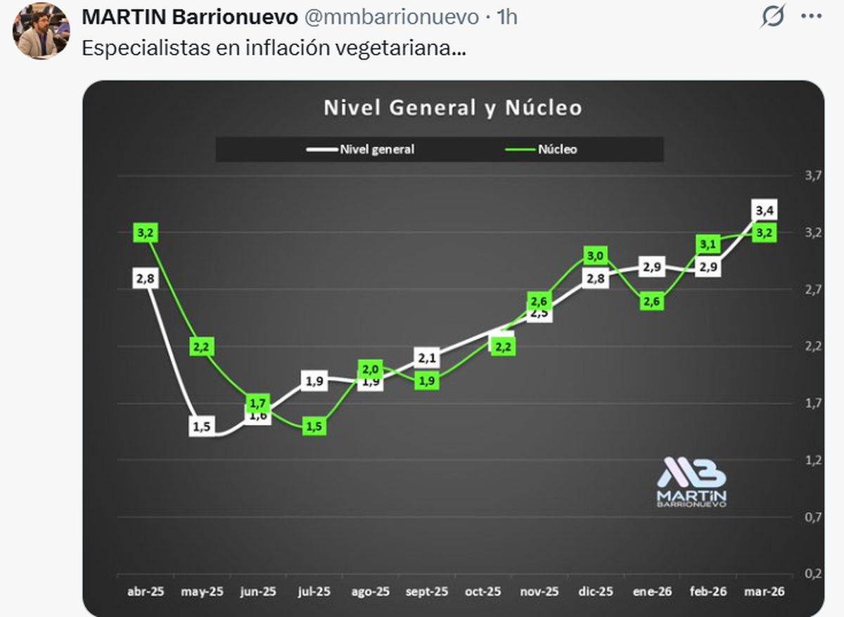 Javier Milei admitiendo que el dato de inflación de marzo "es malo" representa toda una novedad, en un Gobierno que ha empleado todo tipo de malabares discursivos para sostener el relato de la desinflación (su caballito de batalla), aún cuando los datos vienen mostrando lo contrario desde junio de 2025.