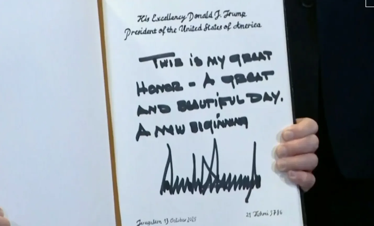 - El líder de la Casa Blanca, los presidentes de Egipto y Turquía y el emir de Qatar firmaron el texto del acuerdo de paz de Gaza en una ceremonia en la cumbre de Sharm el Sheij en presencia de unas dos docenas de jefes de Estado.La firma de la "paz" ocurrió en vísperas del cuarto día del alto al fuego entre Hamás e Israel y en la misma jornada en la que veinte rehenes israelíes y centenares de presos palestinos —250 de ellos condenados a cadena perpetua— recobraran la libertad.
