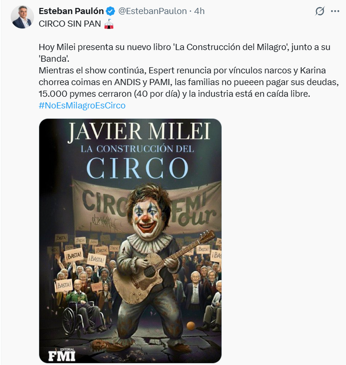 Javier Milei se autopercibe 'rockstar' y encabeza este lunes (06/10) un show musical en el Movistar Arena para presentar su libro "La construcción del milagro". Un evento con poco timing, en días de crisis política y económica, con el que el Presidente busca fingir normalidad (todo marcha bárbaro...) pero, en rigor, es un evento para la propia tropa resquebrajada: se prevé fuerte presencia de Las Fuerzas del Cielo, lideradas por Daniel Parisini / Gordo Dan (bajo el mando de Santiago Caputo), que hoy tendrán lugar privilegiado tras haber sido 'ninguneadas' en las listas.