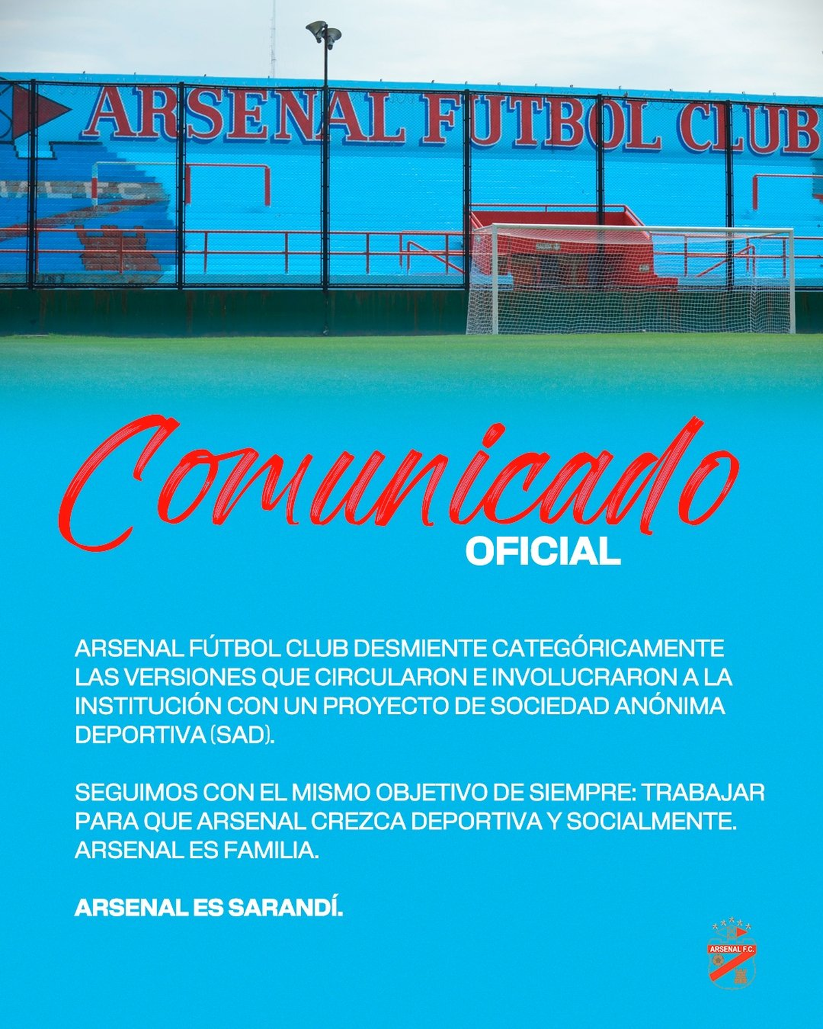 "Seguimos con el mismo objetivo de siempre: trabajar para que Arsenal crezca deportiva y socialmente. Arsenal es familia. Arsenal es Sarandí", cierra.