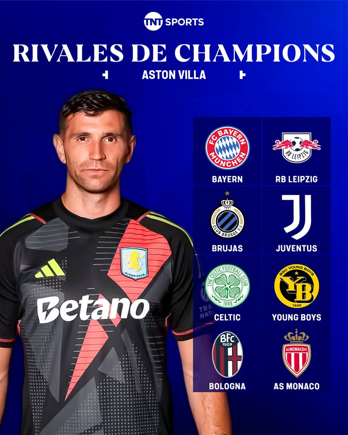 Emiliano “Dibu” Martínez hará su debut en la Champions League con Aston Villa y los rivales que tendrá serán los que compartimos a continuación, aunque todavía falta definir el orden en que los enfrentará. Bayern Múnich y Leipzig de Alemania, Juventus y Bologna de Italia, Celtic de Escocia, Young Boys de Suiza, Brujas de Bélgica y Mónaco de Francia.