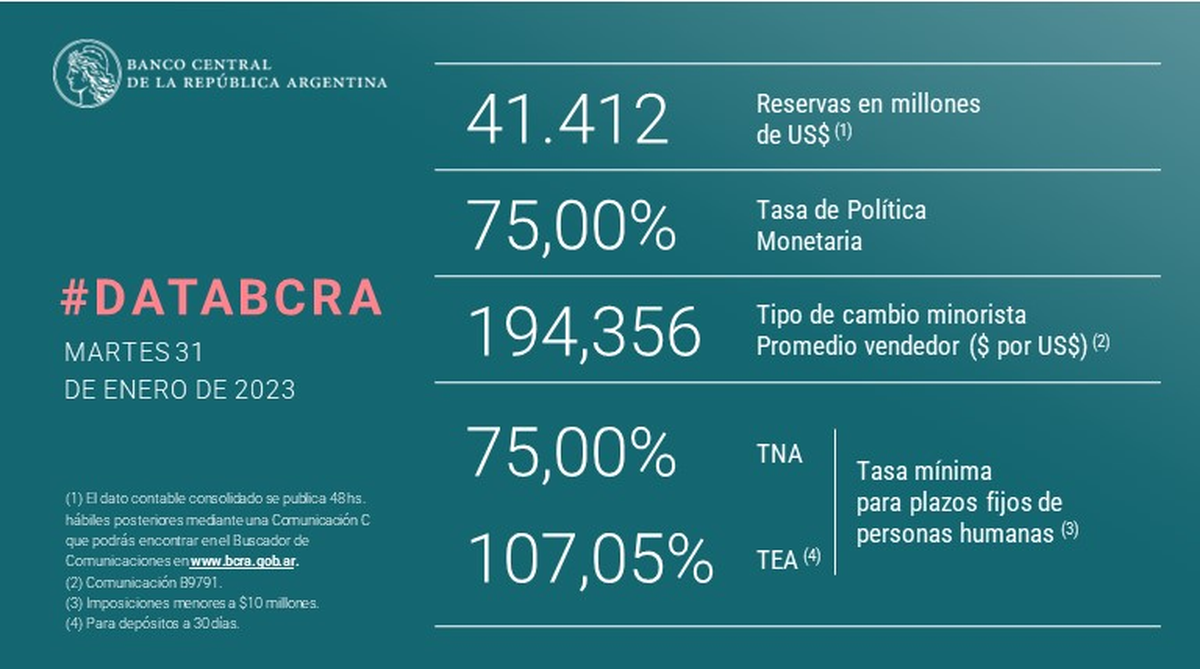 Según el BCRA, las reservas brutas (al 31/1) se ubican en US$ 41.412 millones
