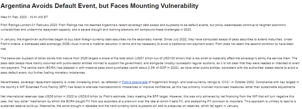 Hoy, miércoles 1 de febrero, la agencia internacional de calificación crediticia de doble sede en Nueva York y Londres, Fitch Ratings, habló sobre Argentina, destacando que: "No consideramos las recompras de deuda soberana como default, pero las deficiencias políticas siguen aumentando las vulnerabilidades económicas y socavando la capacidad de reembolso. Una grave sequía y las inminentes elecciones agravarán estos retos".