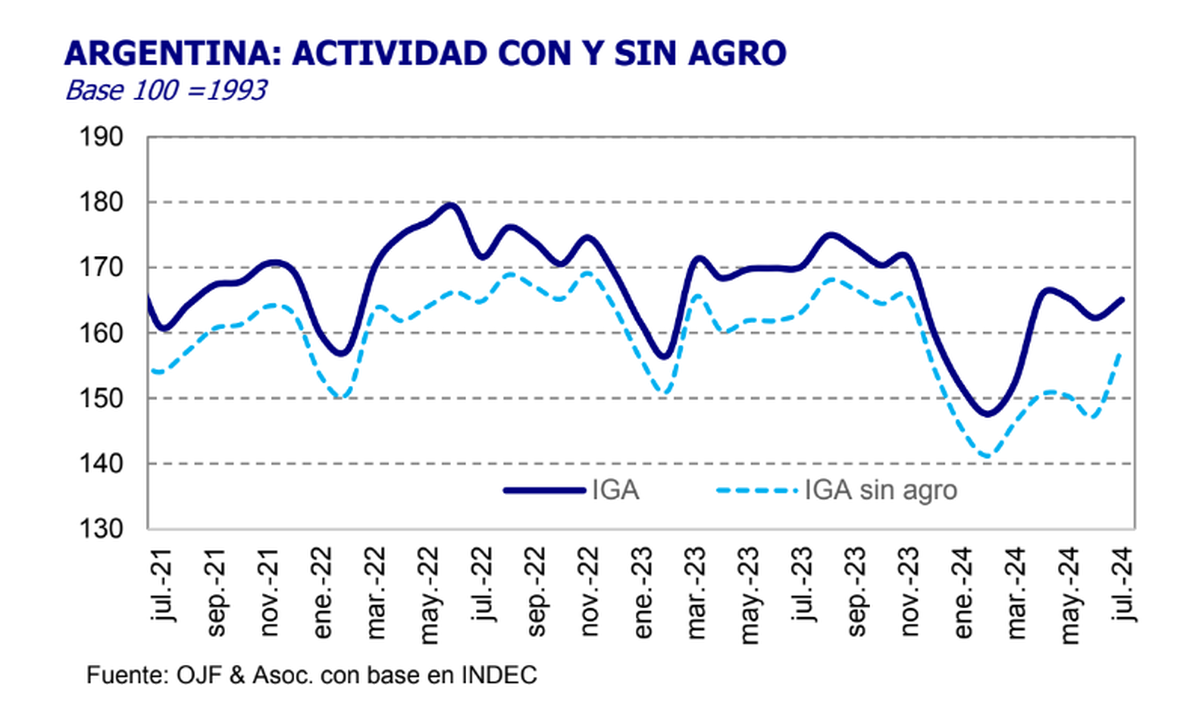 "Durante julio la actividad económica registró una suba de 0,8% respecto de junio, de acuerdo a la estimación del IGA-OJF. Así, a pesar de una corrección a la baja que sufrió el sexto mes del año, el nivel actual de la serie desestacionalizada se ubica 2,0% por encima del piso tocado en marzo", explicó la consultora en su Índice General de Actividad (IGA).