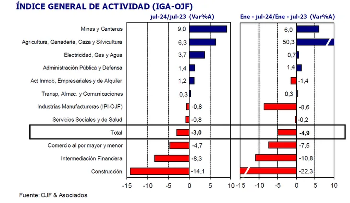 La actividad económica cayó en julio un 3% en la medición interanual, pero experimentó un leve rebote en relación al mes previo, según el último informe de la consultora de Orlando Ferreres. En el acumulado de lo que va del año, en tanto, la variación fue negativa en un 4,9%.