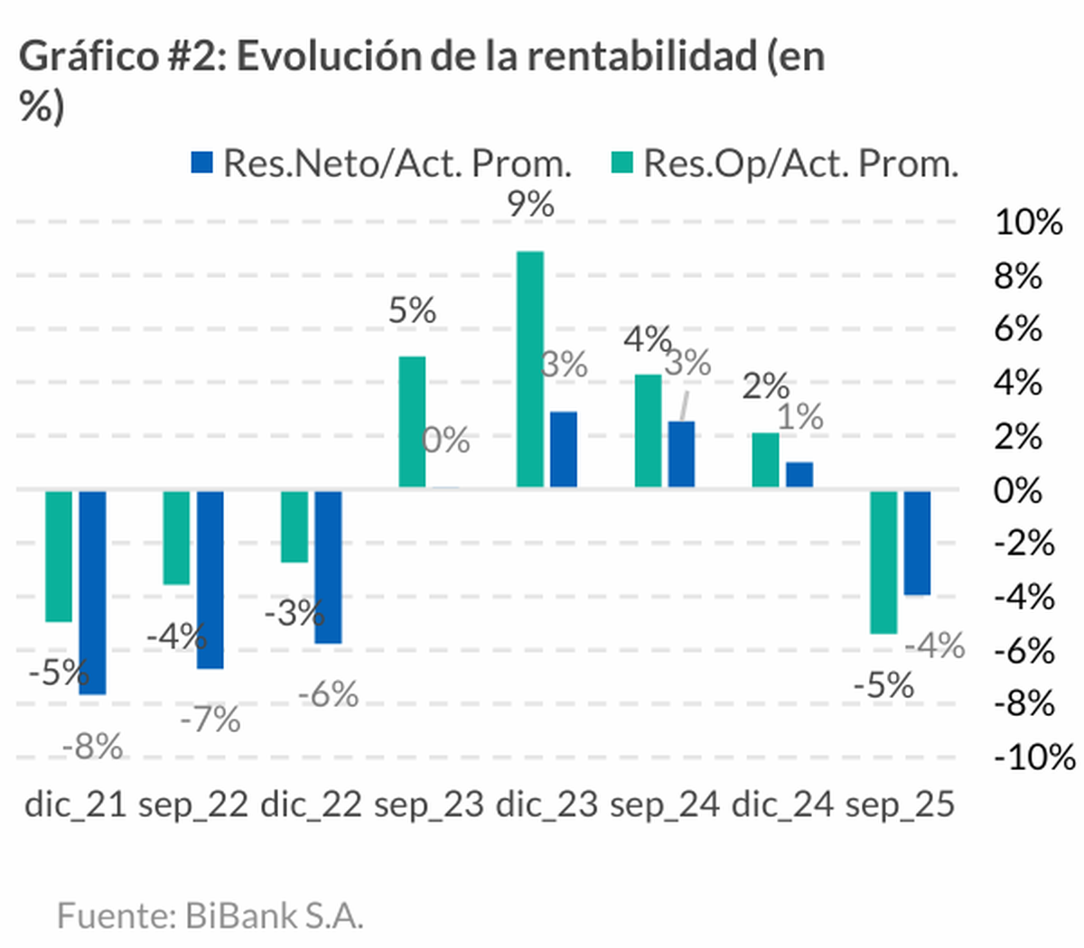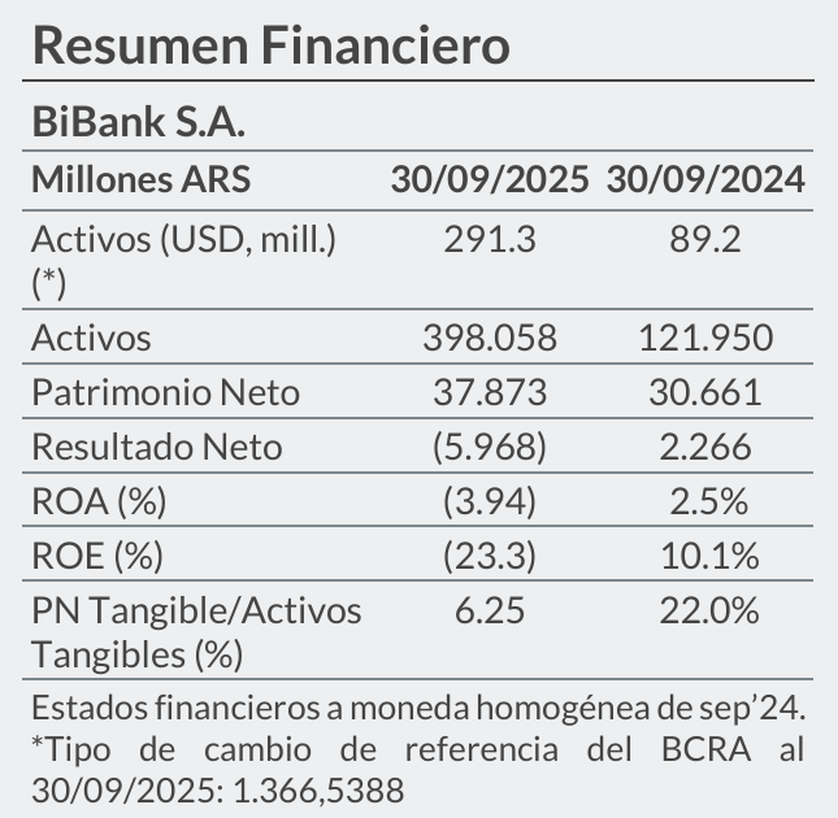 El dato más contundente surge del desempeño financiero. A septiembre de 2025, BiBank registró una pérdida neta de $5.968 millones, muy lejos de la ganancia de $2.266 millones obtenida un año antes. El impacto se reflejó de lleno en los indicadores de rentabilidad.