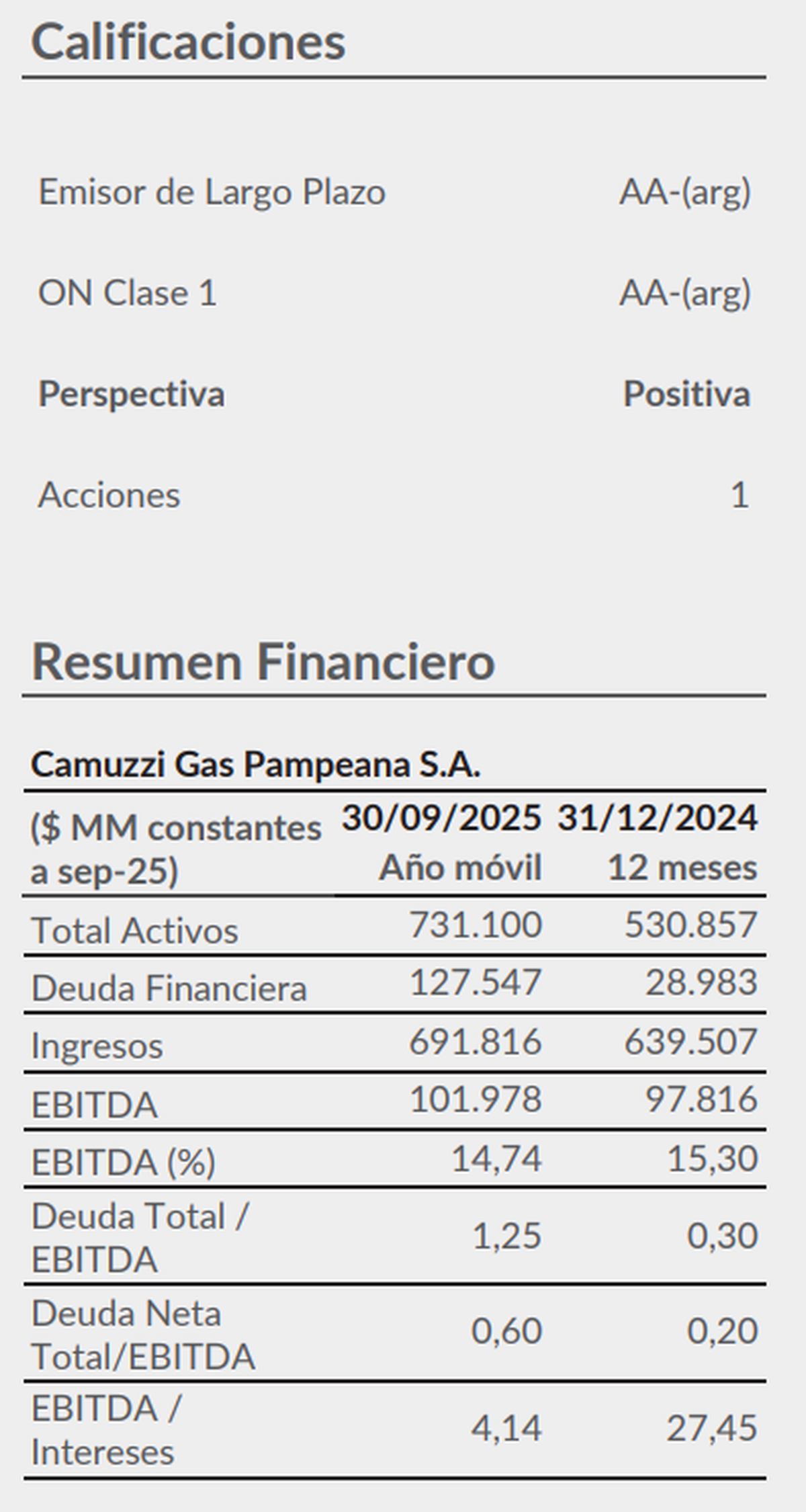 Camuzzi Gas Pampeana recibió una señal importante desde el frente crediticio. FIX, la afiliada local de Fitch Ratings, confirmó la calificación de emisor de largo plazo en AA-(arg) con perspectiva positiva, ratificó en la misma categoría a sus Obligaciones Negociables Clase 1 y mantuvo en Categoría 1 a sus acciones ordinarias. La decisión, fechada el 9 de marzo de 2026, refleja una mejora concreta en la generación de caja, un esquema tarifario más ordenado y un nivel de deuda que sigue siendo manejable.