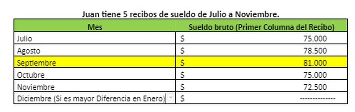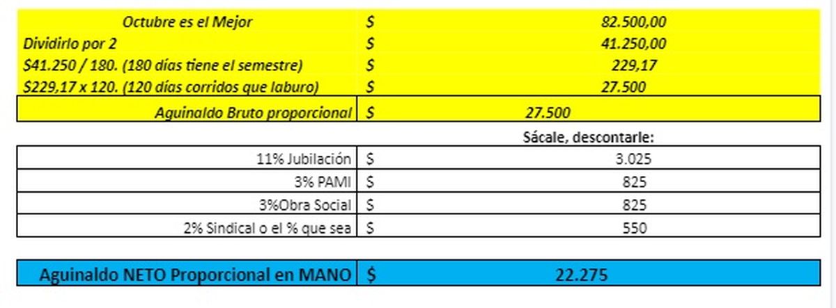 Aclarando que, debido a que el aguinaldo se cobra el lunes 19/12, el mes de diciembre no se toma de base ahora, sino que se paga la diferencia en enero. El abogado compartió los siguientes ejemplos para facilitar a las personas cómo hacer el cálculo matemático: