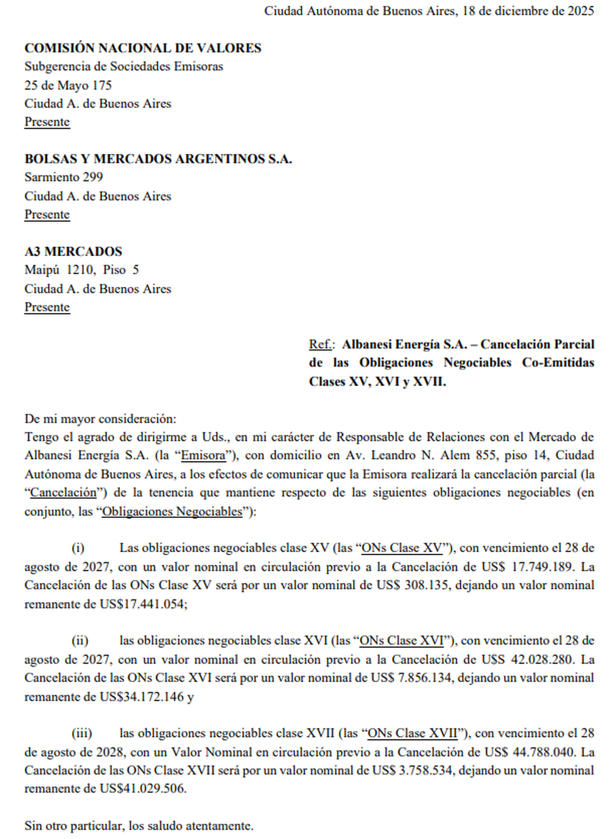 En paralelo, Albanesi Energía informó la cancelación parcial de ONs co-emitidas, reduciendo el capital en circulación de las Clases XV, XVI y XVII por más de US$11 millones. El movimiento aporta una señal adicional de disciplina financiera y ayuda a achicar stock de deuda.