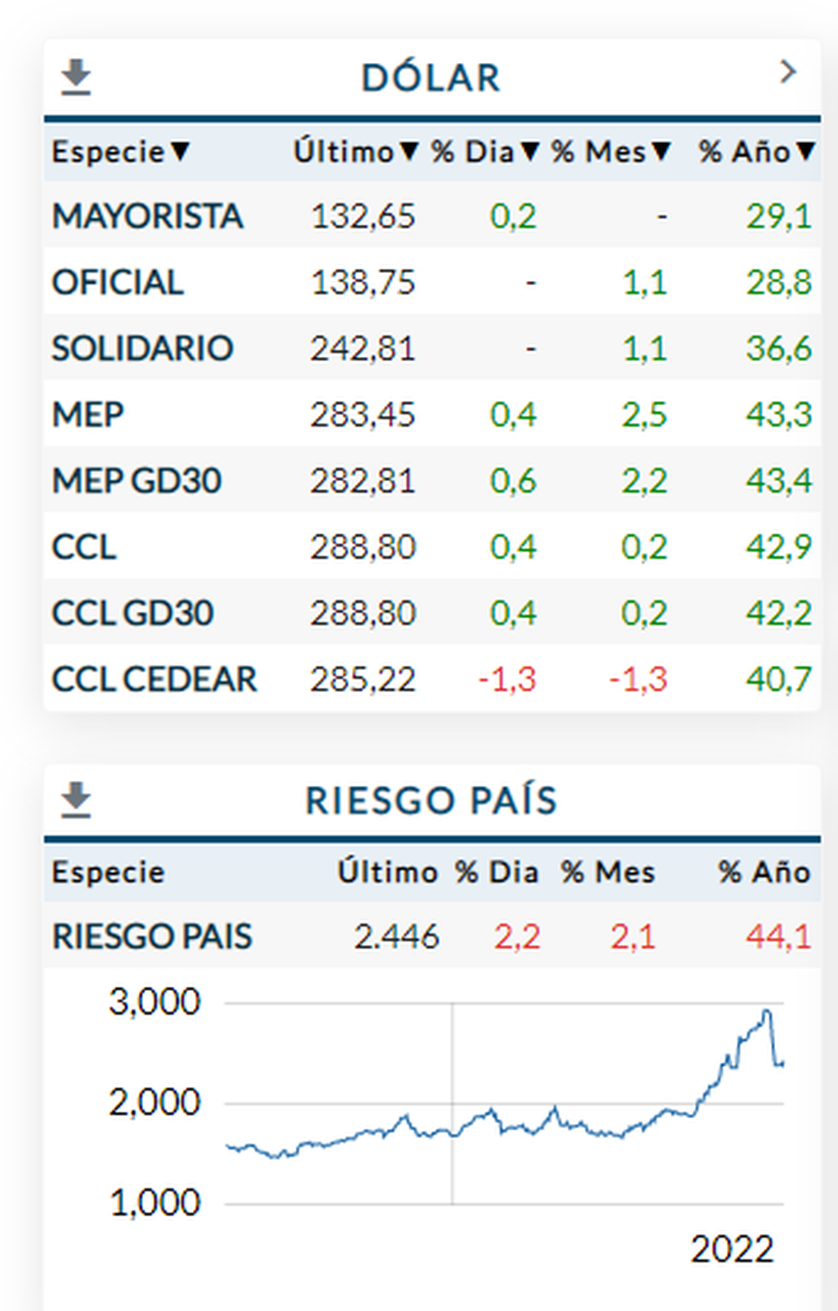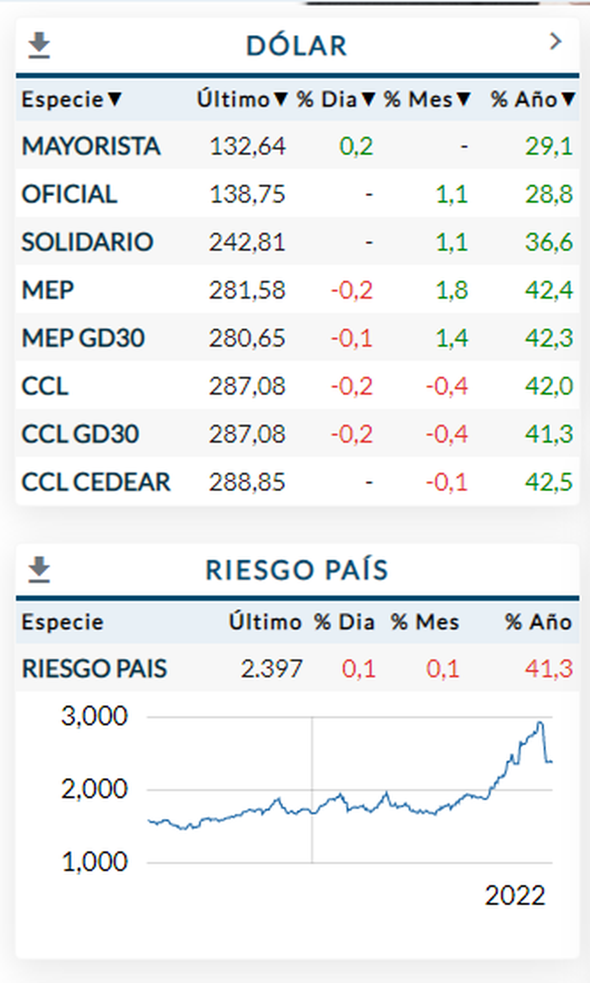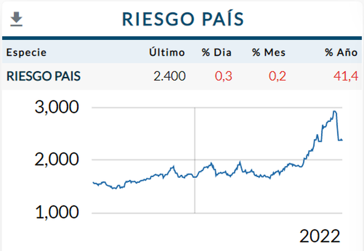 Por otro lado, el Riesgo País vuelve a encontrar terreno en el nivel de los 2.400 puntos básicos.