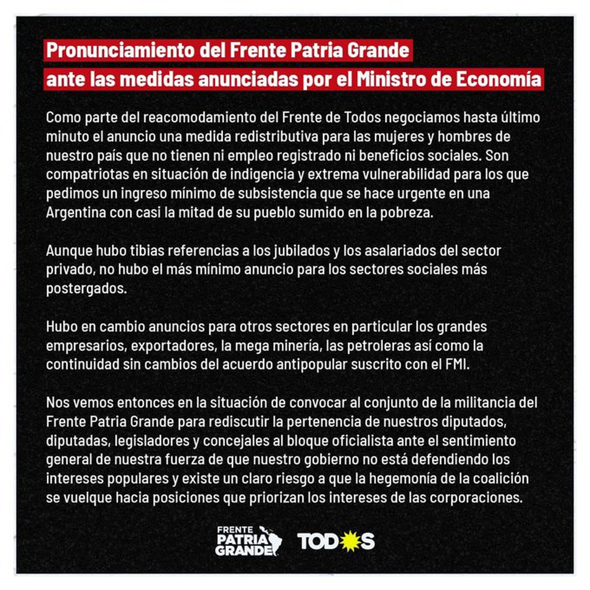 El Frente Patria Grande convocó a una asamblea para evaluar su pertenencia al bloque del Frente de Todos