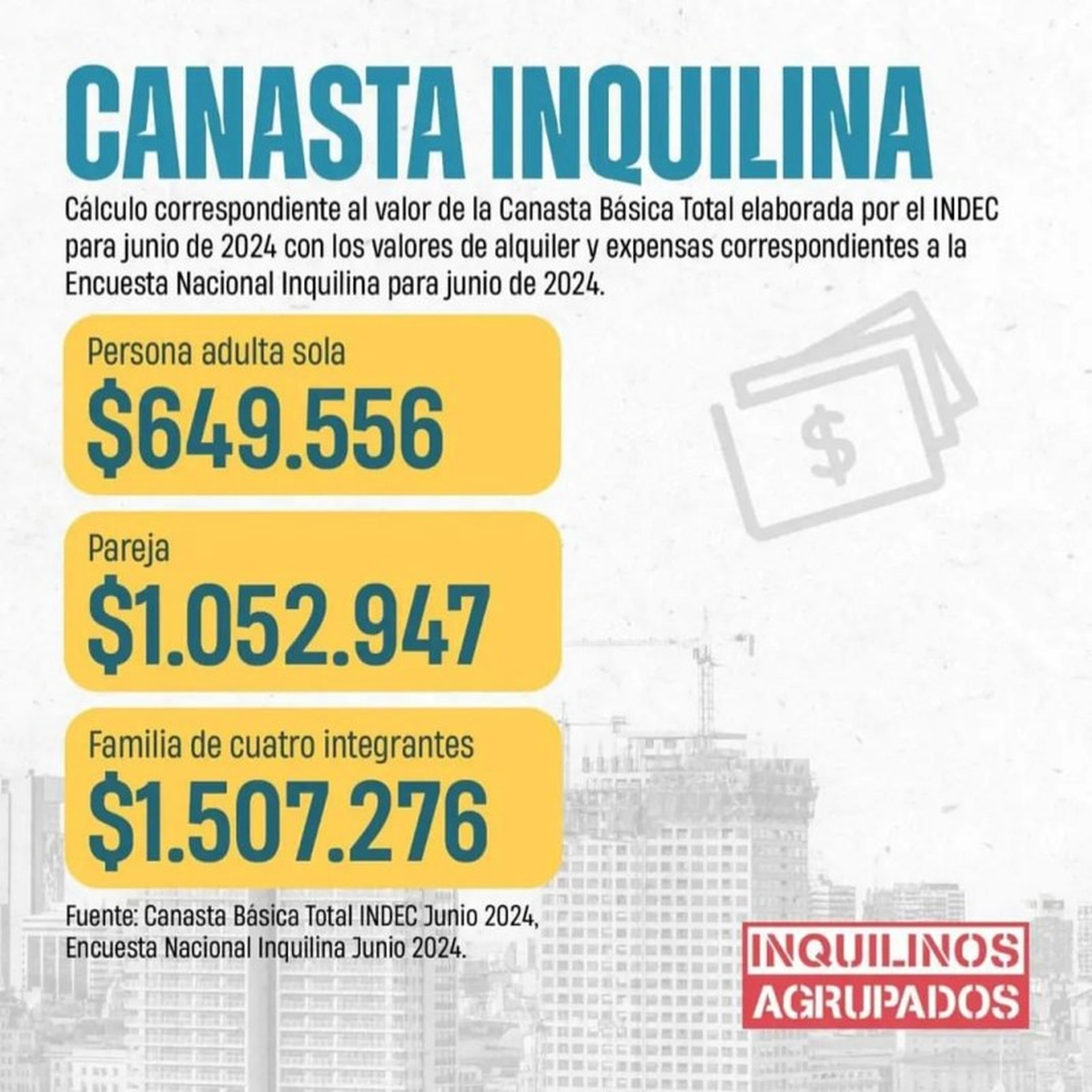 Dicha Canasta es el resultado de cruzar los datos de pobreza e indigencia del Instituto Nacional de Estadísticas y Censos (INDEC), reflejados en la Canasta Básica Total (CBT) de junio con el relevamiento de precios de alquileres del hogar realizado por la propia agrupación en ese mes.