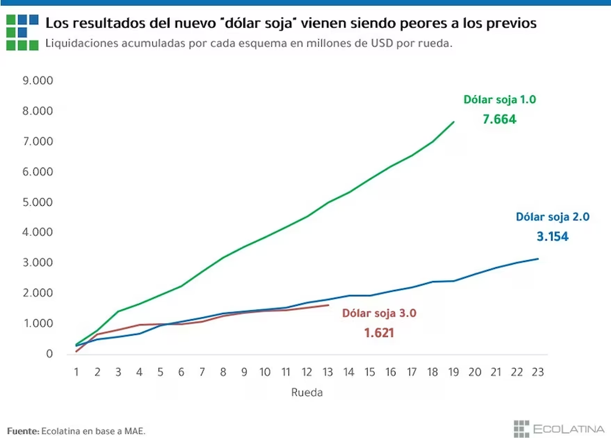 Santiago Manoukián, economista de Ecolatina, destaco que: "En las 5 ruedas de la semana, las liquidaciones por dólar soja 3 sumaron casi US$ 360 millones, mientras que desde su inicio (13 ruedas en total) se liquidaron US$ 1.621 millones, 11% menos que en el mismo lapso del dólar soja 2.0 (US$1.824 millones) y bien por debajo de los US$5.010 millones del dólar soja 1.0”
