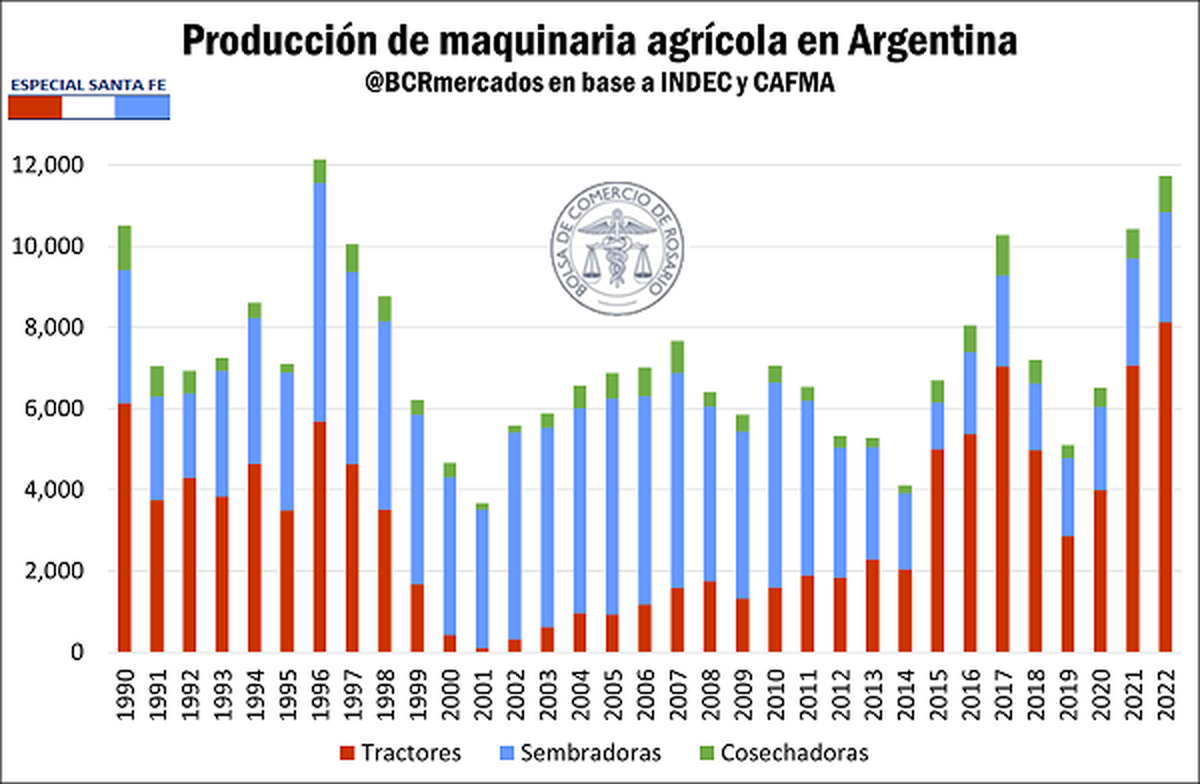 Esto fue detallado por la Bolsa de Comercio de Rosario, donde agregaron que: "Este buen desempeño tiene una particular implicancia para la economía provincial. De acuerdo a datos de IERAL (2021), se encuentran radicadas en Santa Fe 533 empresas fabricantes de maquinaria agrícola y agropartes, lo que representa el 44% de las empresas totales del país y la convierte en la provincia líder del sector (Córdoba posee 398 empresas – 33% del total – y Buenos Aires 162 fabricantes – 14% del total)."