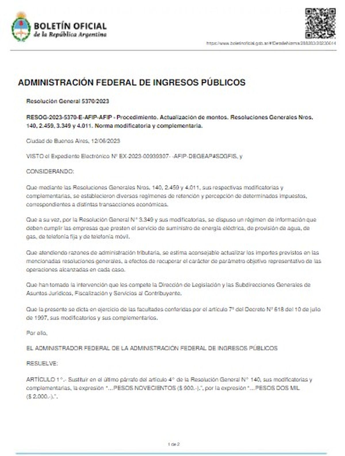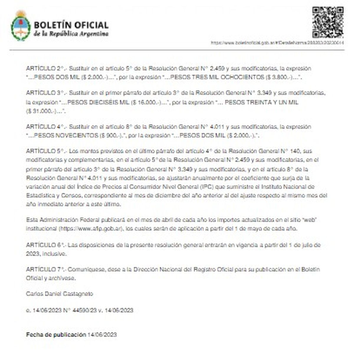 En tanto, el punto 2° alteró el inciso de la Resolución General N° 2459, de forma tal que el piso vigente de $2000 se incrementará a $3800.