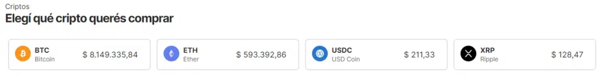 Además de bitcoin, las otras criptomonedas que pueden adquirirse son Ether -ETH-, USD Coin -USDC- y XRP de Ripple. A todas estas monedas digitales puede accederse mediante pesos argentinos.