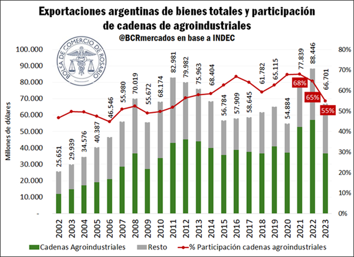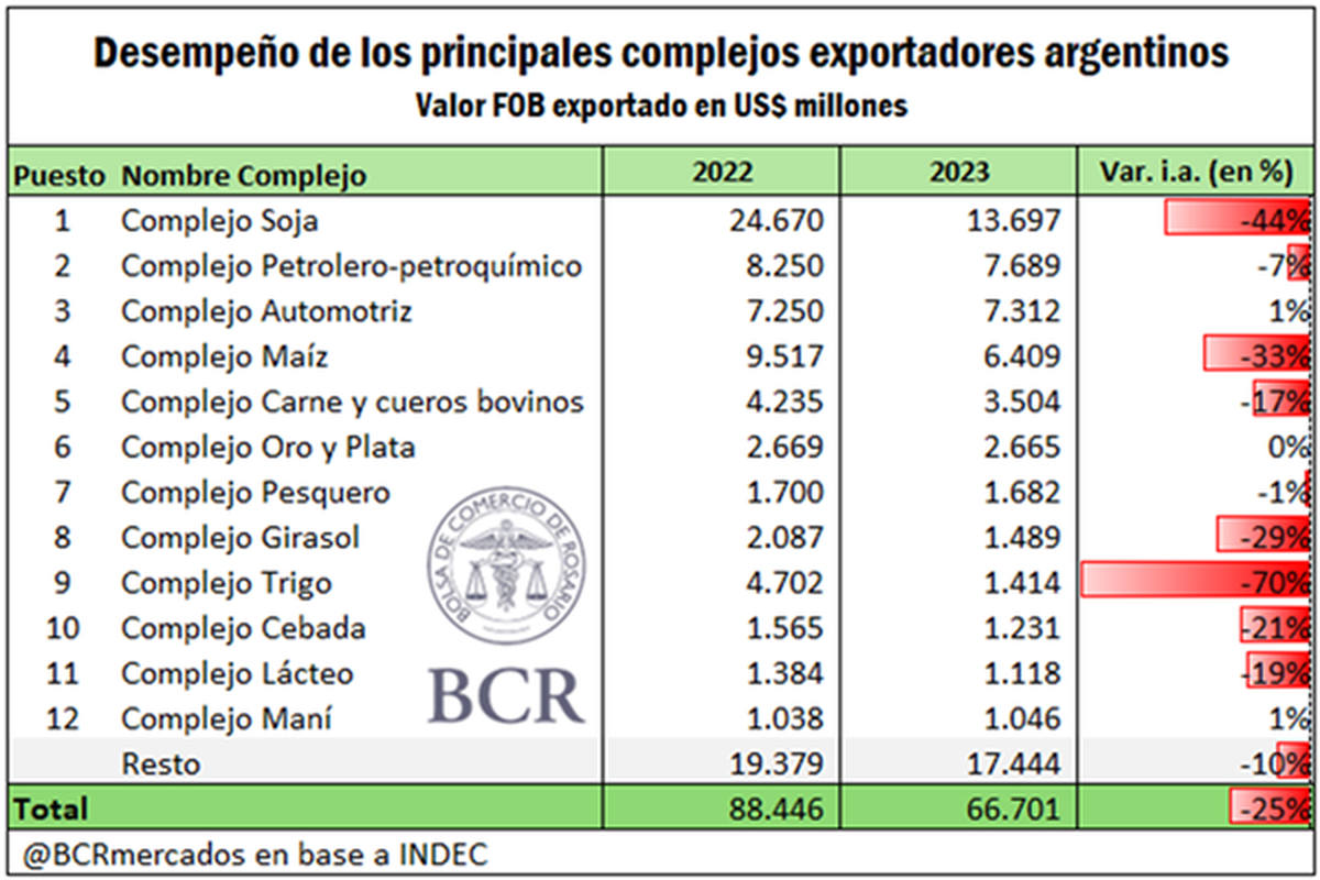 La Bolsa de Comercio de Rosario (BCR) señala como las exportaciones totales en Argentina alcanzaron los US$ 66.701 millones, un 25% menos que en 2022.