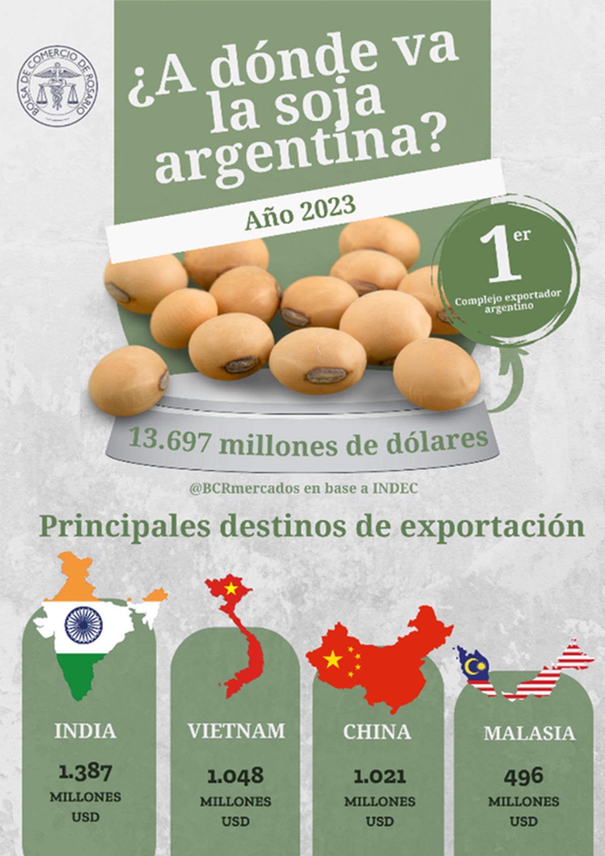 En cuanto a los destinos, la India consolidó su posición como el principal comprador del aceite de soja argentino, mientras que Vietnam lideró las compras de harina de soja, y China se mantuvo como el principal demandante del poroto. Malasia, en cambio, superó a los Países Bajos entre los principales socios del complejo soja, debido a la brusca disminución de las exportaciones de biodiesel hacia la Unión Europea.