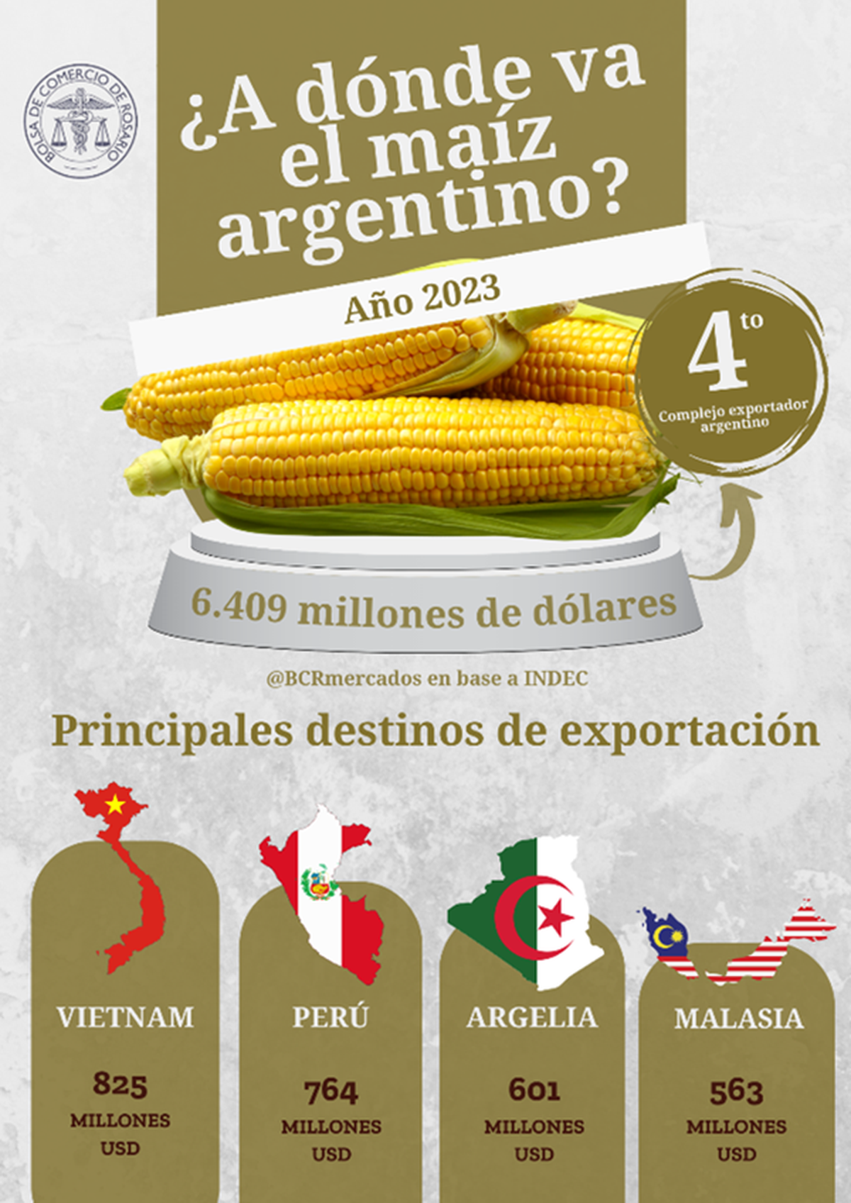 El complejo maíz concluyó el año 2023 con el menor volumen exportado desde 2018, enfrentando una pérdida de superficie del 22% y el peor rendimiento desde 1996. Sin embargo, la superficie sembrada con maíz tardío ayudó a mitigar parte de la crisis productiva. Los principales socios del complejo maicero muestran una diversidad similar a los destinos de la harina de soja argentina, reflejando una tendencia al alza en los stocks ganaderos, lo que augura una demanda positiva en la próxima campaña.