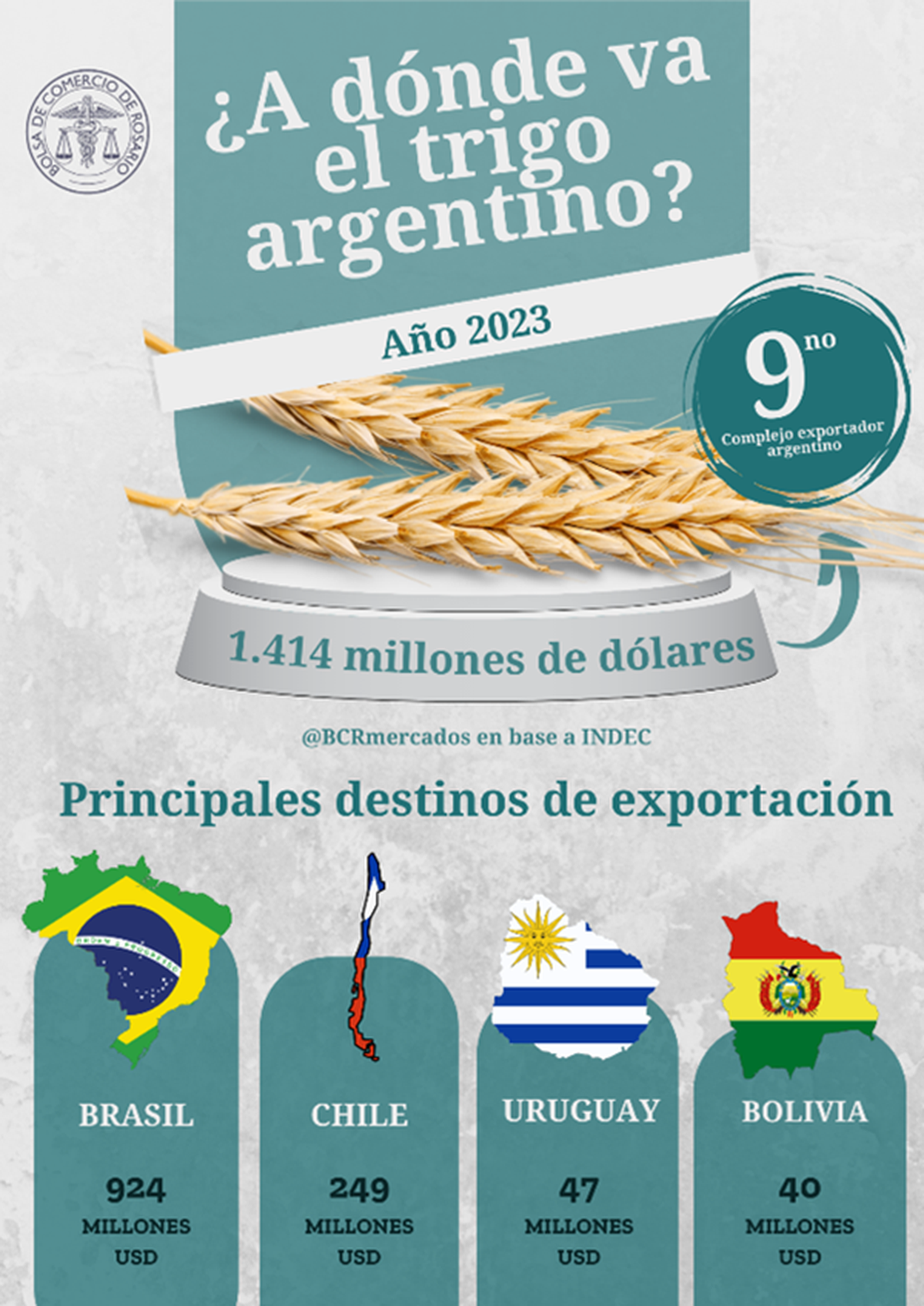 En cuanto al complejo trigo, fue el que más sufrió en términos de exportaciones en 2023, registrando una caída del 70% en el comercio exterior. Exportando el menor volumen de toneladas desde 2014, tocó un mínimo en valor desde 2015.