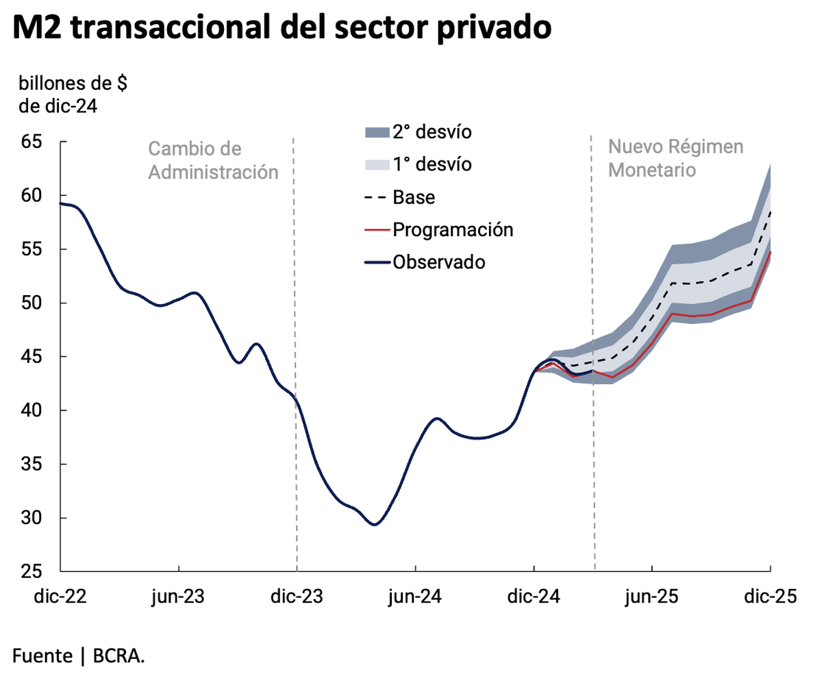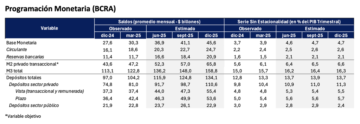 En el plano monetario, el BCRA profundiza el cambio iniciado en diciembre de 2023. El nuevo régimen estará basado en el seguimiento estricto de los agregados monetarios, con énfasis en el M2 transaccional privado como principal ancla nominal.