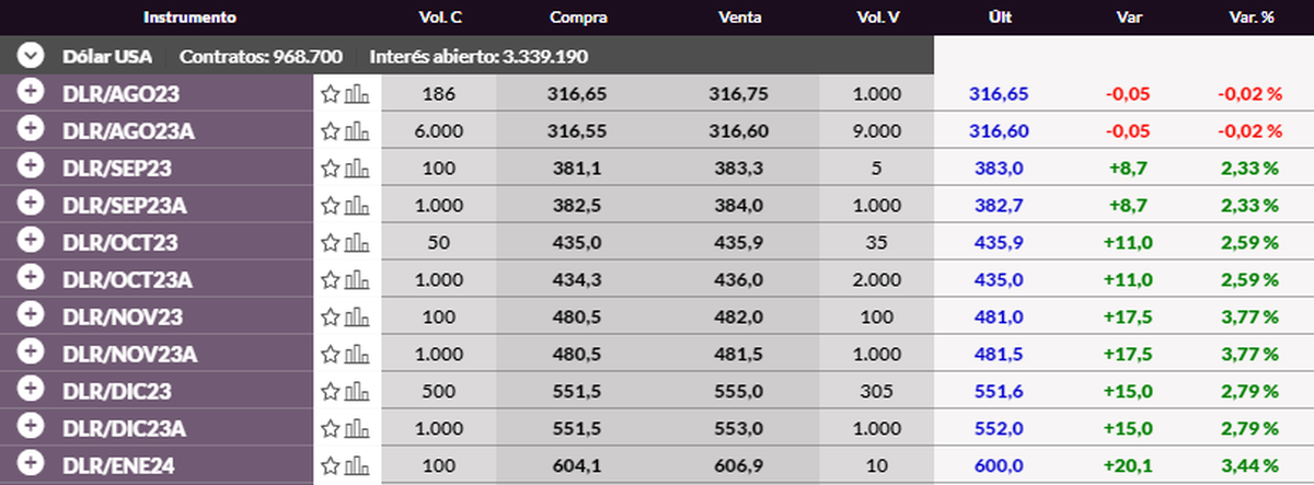 Dado esto, en los contratos del dólar futuro pudo verse hoy (7/8) que la demanda compradora se mostró muy fuerte en la gran mayoría de los meses llegando a anotar un aumento de hasta el 3,77%: