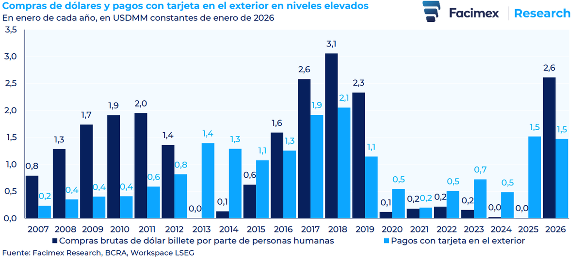 Según Facimex, en enero 1,6 millones de personas compraron dólar billete por US$2,6MM, es decir US$0,4MM más que en diciembre, y el informe considera factible que unos US$0,9MM se hayan utilizado para cancelar consumos con tarjeta en moneda extranjera, recordando además que, según el BCRA, más del 60% de esos consumos se paga con fondos propios.