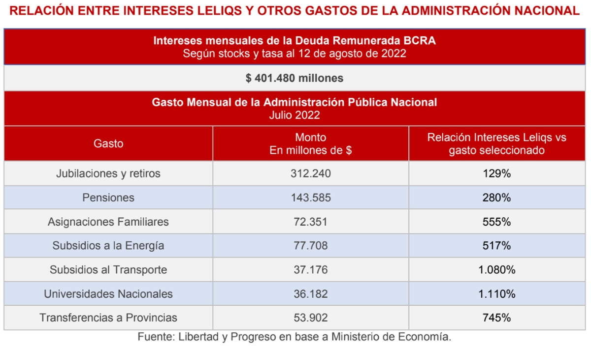 Aún así, con la última suba de tasas, los intereses de la deuda remunerada del BCRA representan el 130% de las jubilaciones. De acuerdo con Libertad y Progreso: