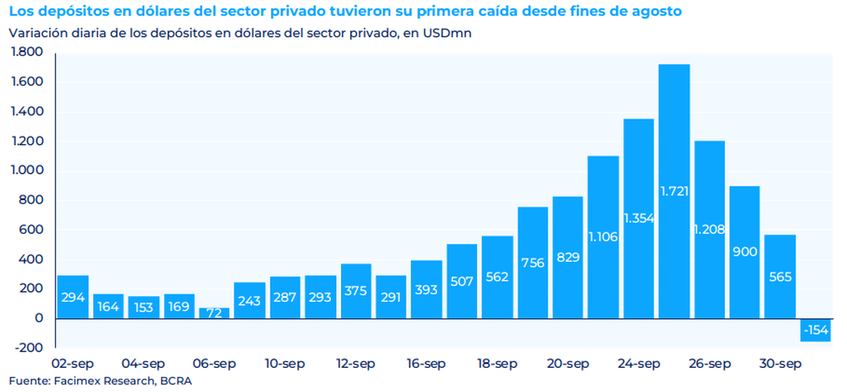 Cuidado BCRA, el 1 de octubre, los depósitos en dólares del sector privado cayeron US$ 154 millones, el primer día en que los fondos blanqueados podían retirarse. Este descenso representa la primera caída desde fines de agosto, marcando un cambio de tendencia tras el fuerte crecimiento registrado a lo largo de septiembre.