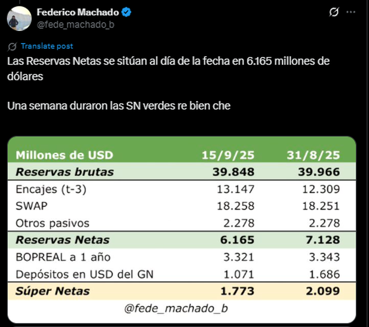 Con reservas líquidas en torno a US$25.000 millones, la autoridad monetaria depende de los US$14.000 millones aportados por el FMI. Según cálculos del Banco Provincia, para sostener este ritmo el Central debería vender US$500 millones diarios, una cifra solo vista en crisis como abril de 2018 o la previa a las presidenciales de 2019.