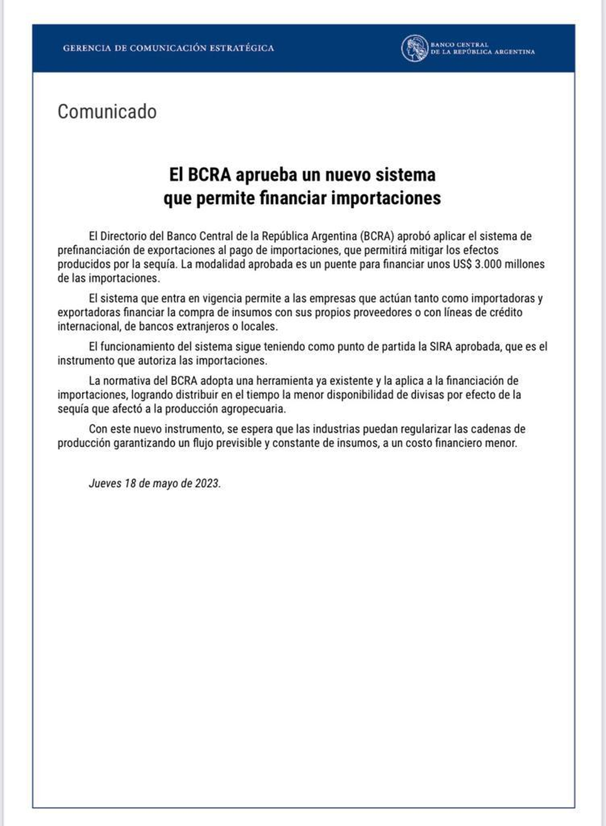 Bajo este marco, el BCRA aprueba un nuevo sistema que permite financiar importaciones. El comunicado oficial de la entidad decía: