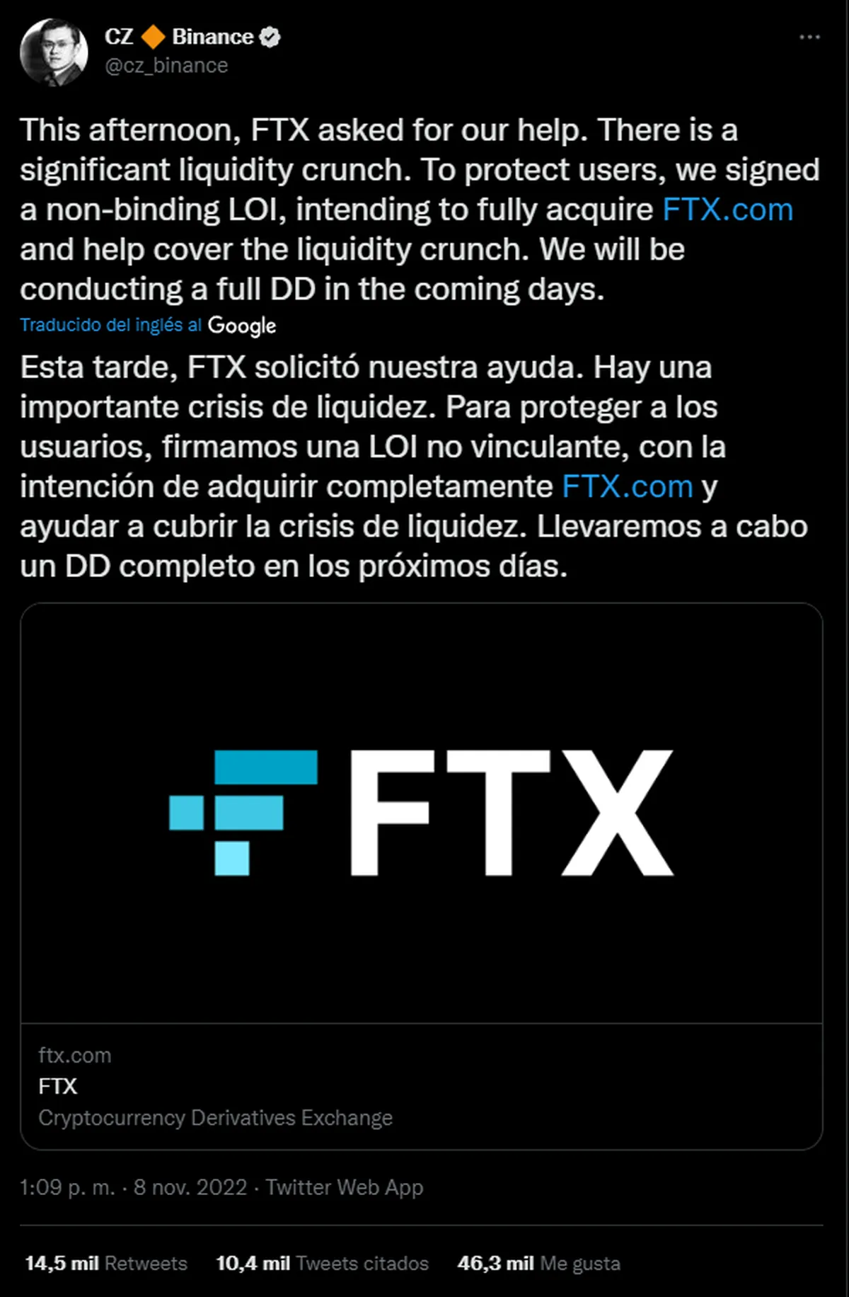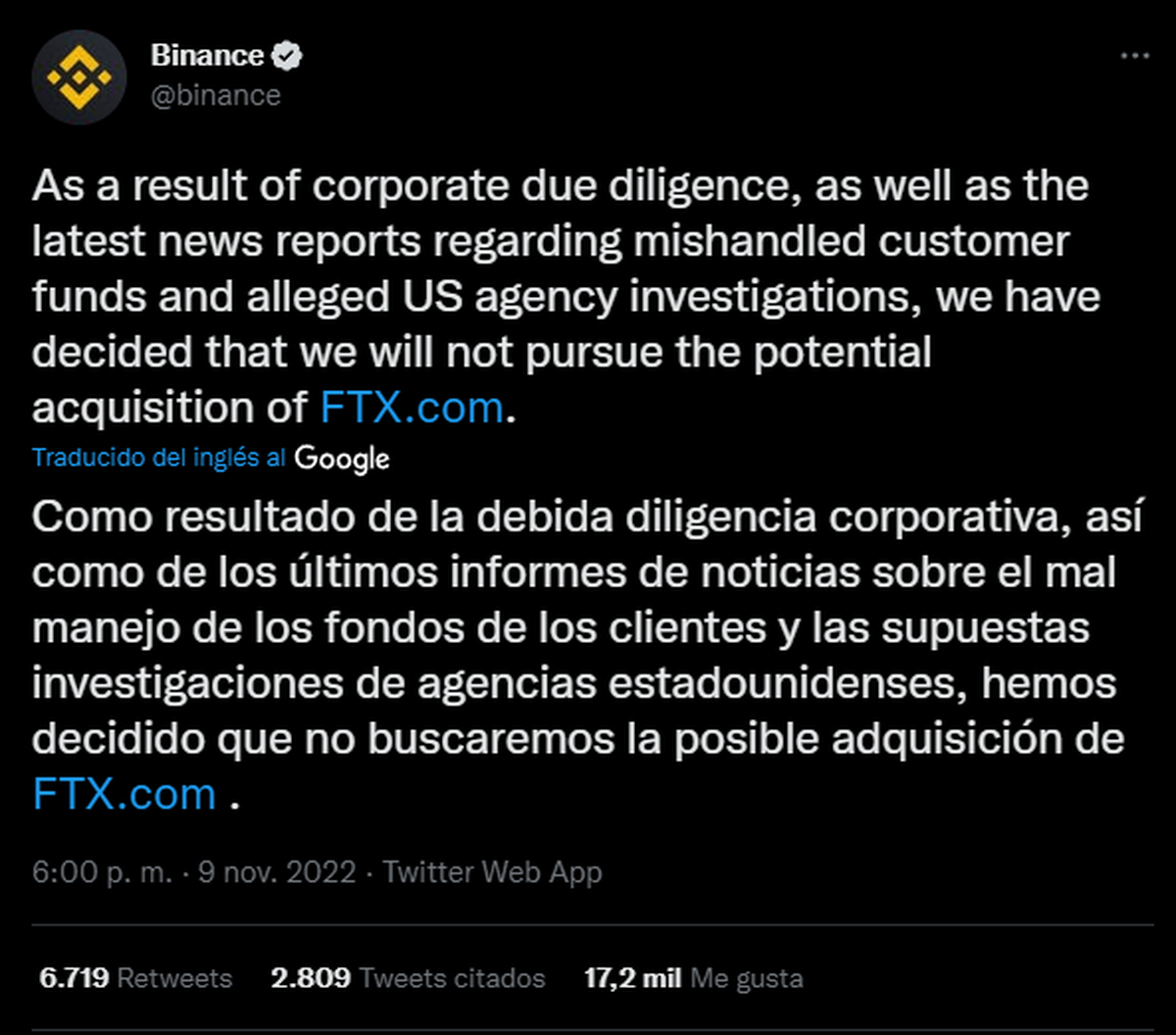 Y es que de acuerdo con CoinDesk, Binance planea dejar de lado el proceso de compra de FTX luego de ver los balances del exchange. Sobre esto, una fuente que no quiso ser revelada: "La carta de intención no vinculante de Binance para la adquisición, anunciada el martes (8/11) cuando la posición financiera de FTX parecía estar fuera de control, dependía de que Binance realizara la debida diligencia. Aproximadamente medio día después de que el proceso de revisión de los datos internos y los compromisos de préstamo de FTX ha llevado a Binance a inclinarse fuertemente en contra de completar la transacción."