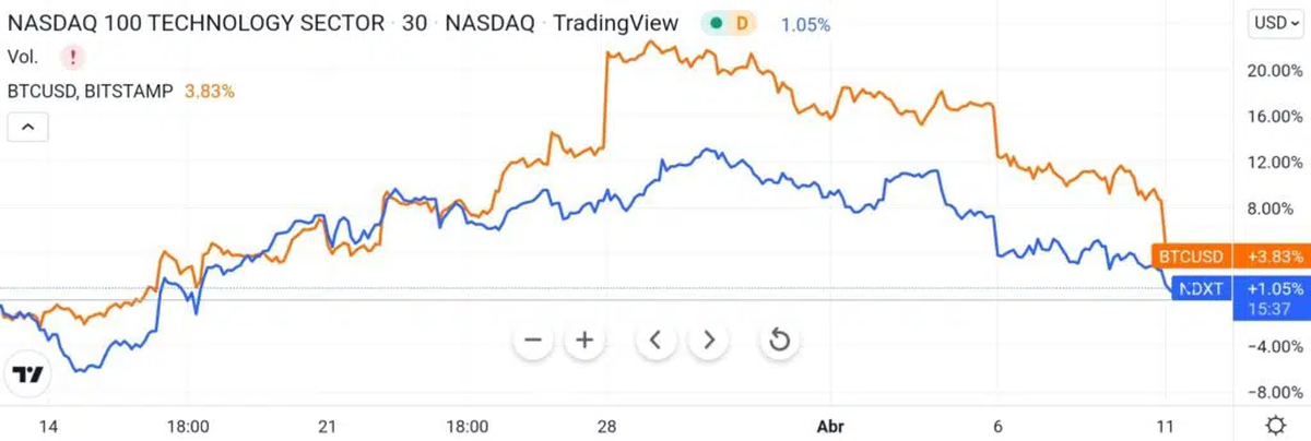 Aunque, el alza de bitcoin ha sido mayor que las acciones tecnológicas de Nasdaq durante este tiempo. Incluso, a pesar de la actual caída, BTC mantiene un crecimiento del 3,83%, mientras que NDXT del 1,05% en el último mes, como se ve la comparación el gráfico de TradingView.