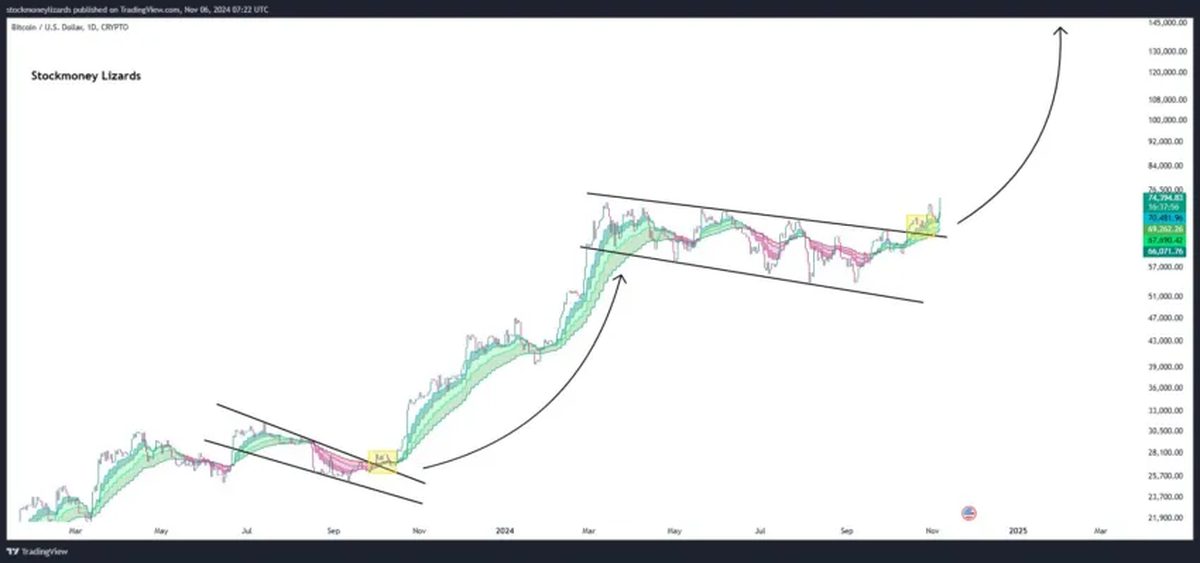 El analista Benjamín Isaza de BeInCrypto señaló que, si bien el banderín alcista proyecta un objetivo de 84.000 dólares, es crucial que Bitcoin se mantenga por encima de 68,000 dólares para que el impulso continúe. Sin embargo, el gráfico semanal de Bitcoin muestra un patrón similar al de 2021, cuando la criptomoneda alcanzó un récord en abril y luego retrocedió antes de registrar otro máximo en noviembre.