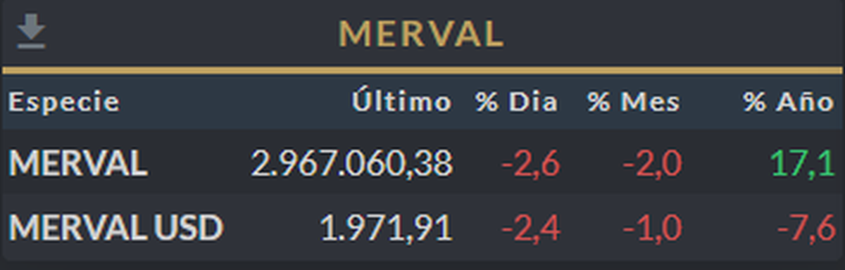 El Merval cae 2,6% y retrocede también 2,4% en su versión dólar MEP, ubicándose en 1.971,91 dólares, un nivel que refleja la pérdida de impulso del rally previo.