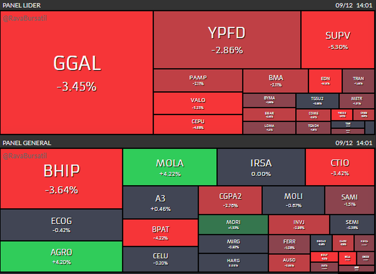 El mapa de calor aporta claridad visual. GGAL, YPF, SUPV, CTIO y BHIP concentran la mayor presión bajista, mientras que los pocos verdes —como MOLA (+4,22%) y AGRO (+4,20%)— aparecen aislados en un mar rojo.