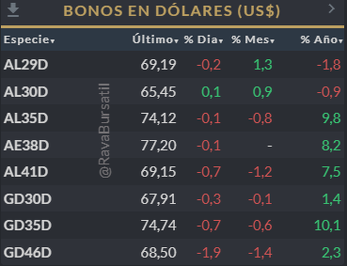 - GD46D muestra la peor dinámica con -1,9%, quedando en 68,50 dólares.