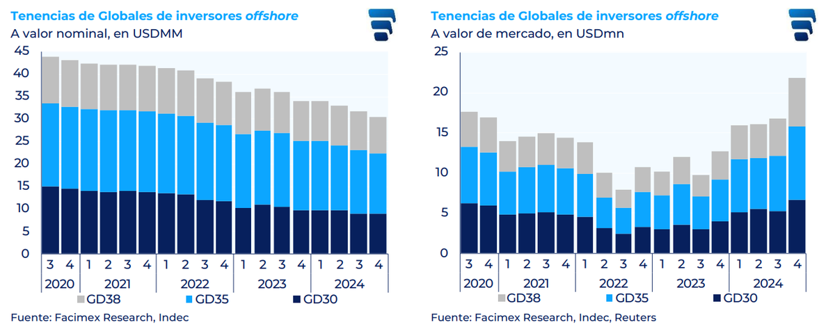 En términos de inversión, tal como destacan desde Facimex, los bonos soberanos en dólares siguen siendo la mejor apuesta. La última información disponible muestra que los inversores extranjeros redujeron su exposición en el cuarto trimestre de 2024, mientras que el rally fue impulsado por actores locales. A pesar de esta salida, la valorización de los títulos indica que la exposición total ha alcanzado su punto más alto desde la reestructuración de 2020.